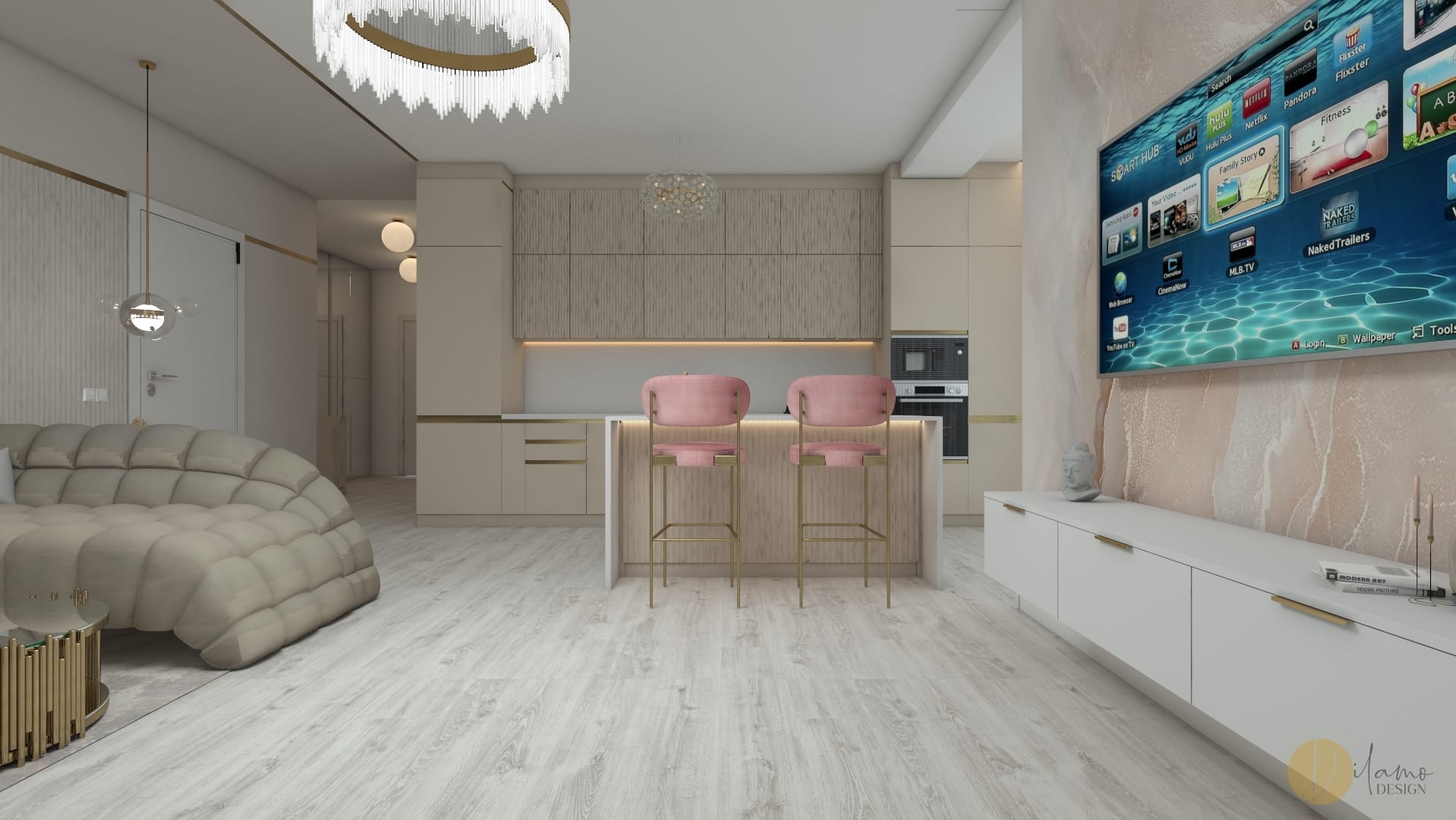 Designul apartamentului subliniază iluminatul modern, decorul eclectic și amestecul de linii curbe și drepte.