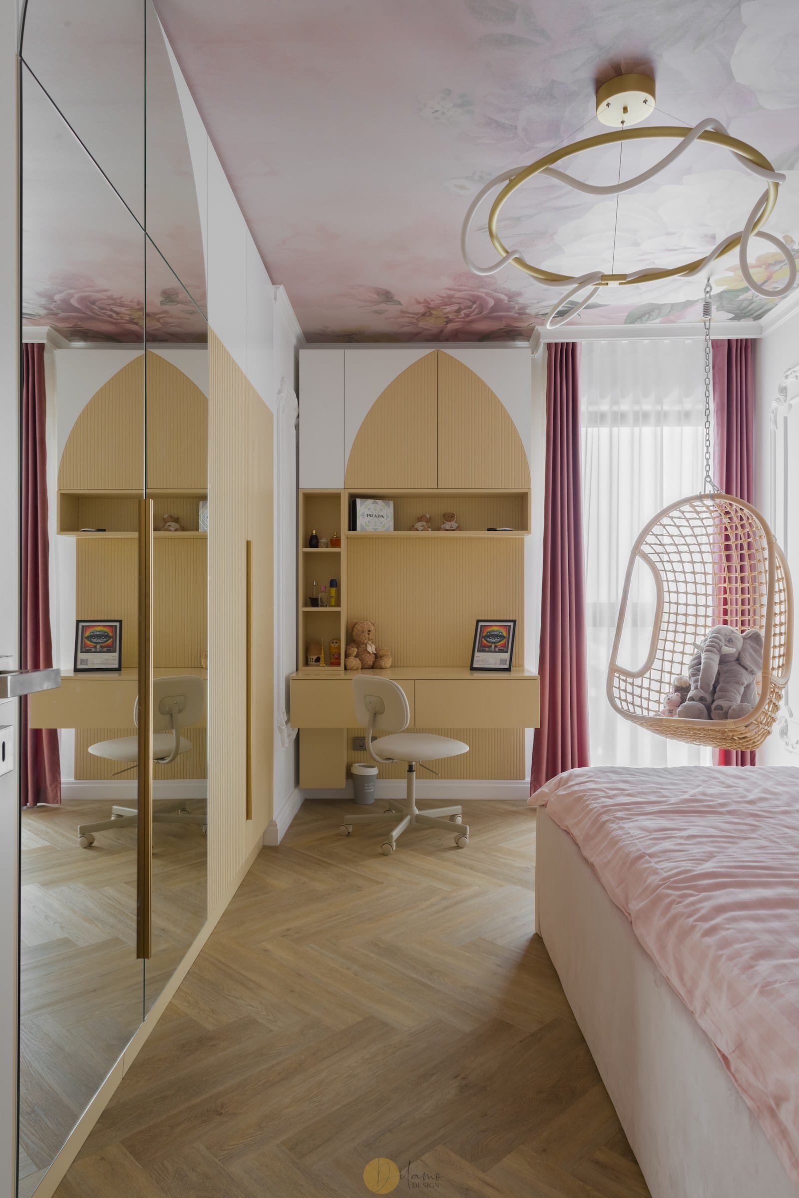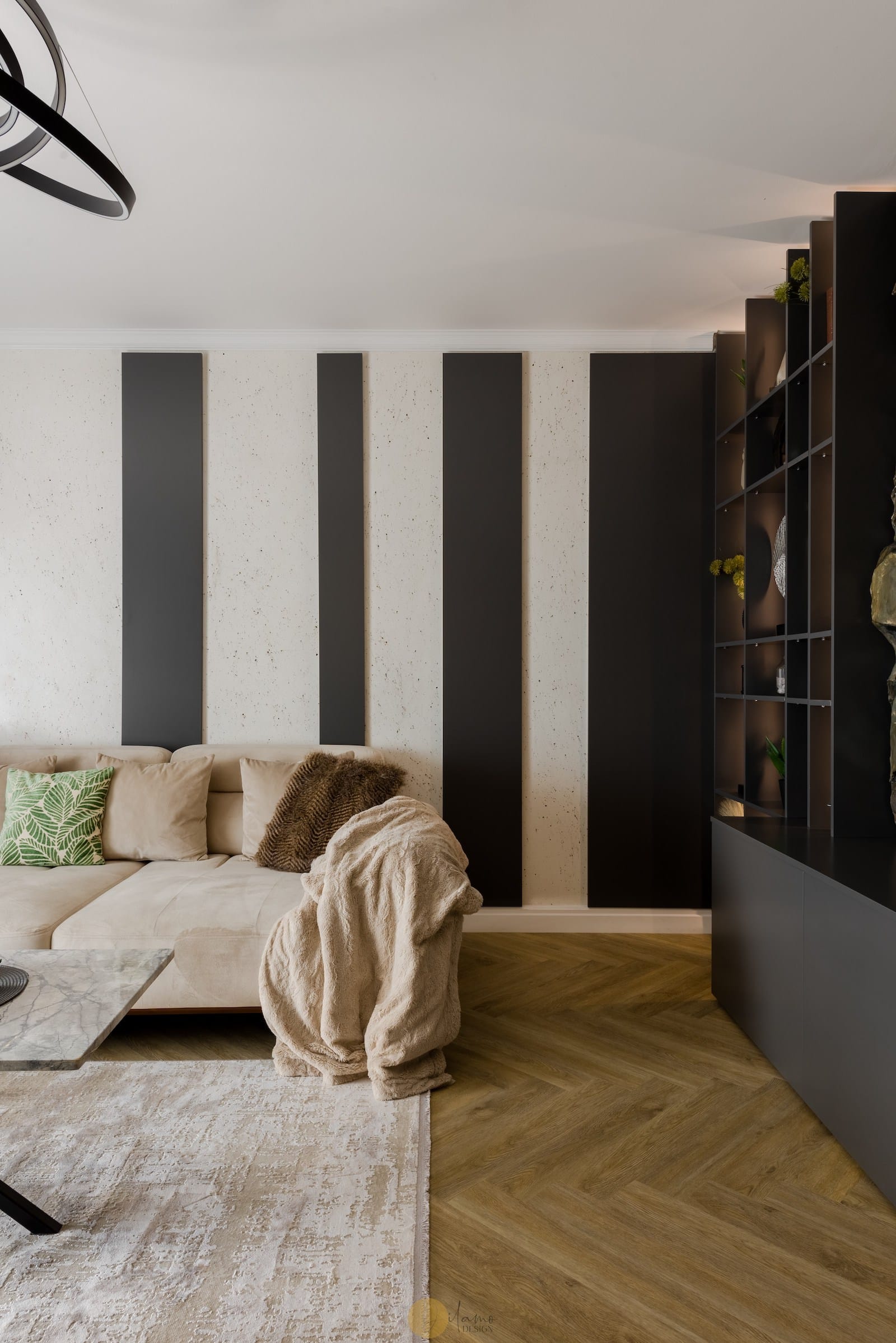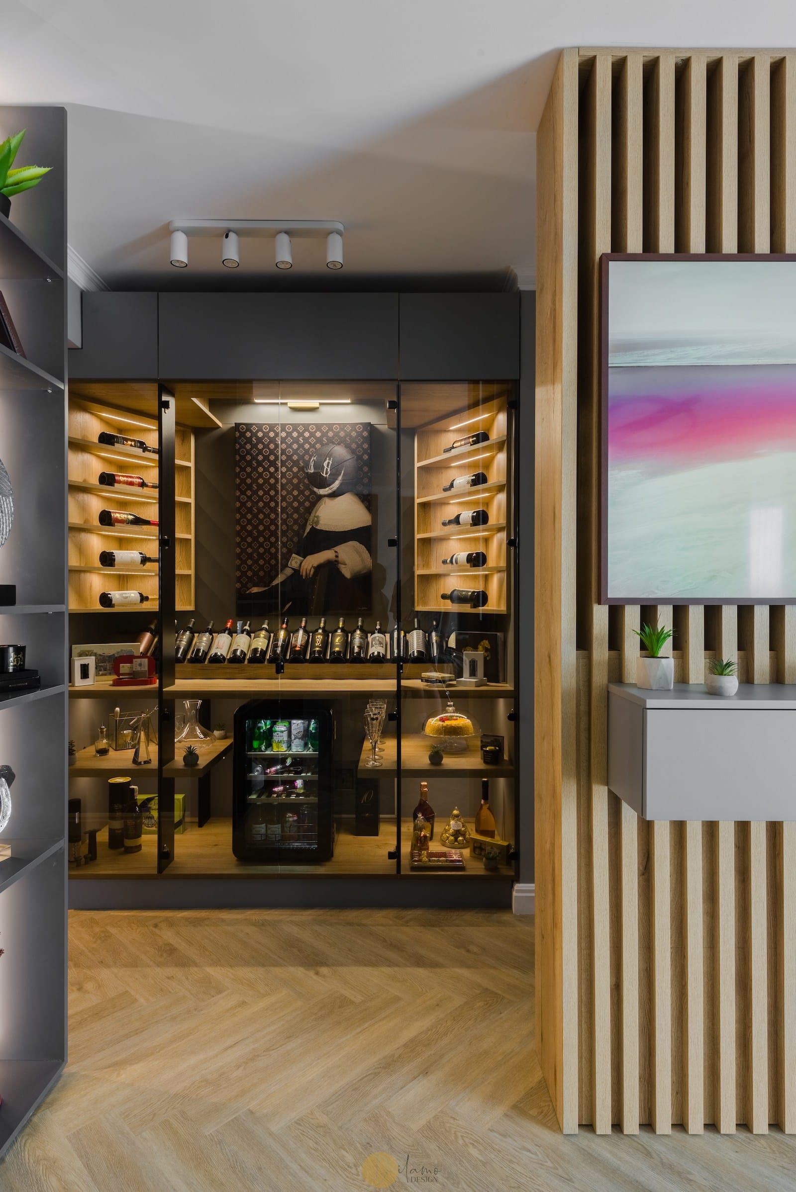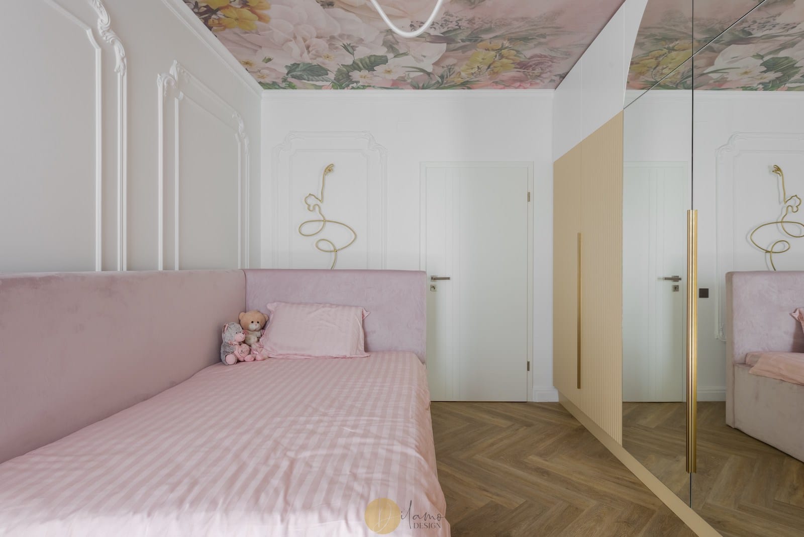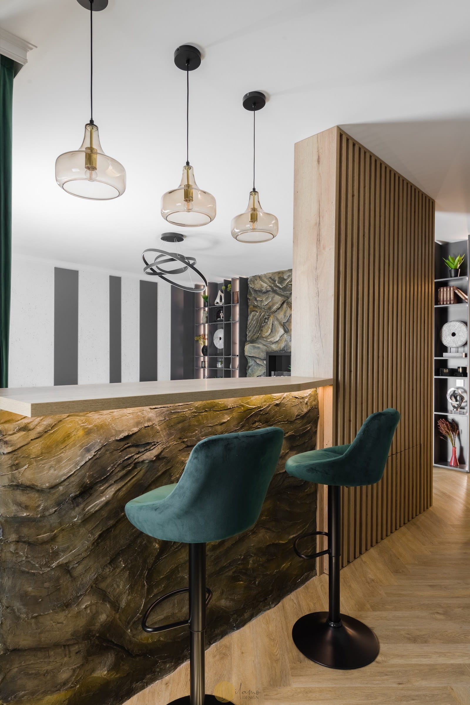 Combinația de elemente masculine avangardiste cu texturi calde și primitoare subliniază personalitatea unui tată puternic care împarte apartamentul cu fiica sa. Vinoteca și nuanțele puternice de negru și gri combinate cu naturalețea texturilor de lemn și a culorilor neutre creează un spațiu masculin, potrivit unui bărbat ce apreciază vinurile fine. În același timp, dormitorul fetiței combină culori blânde și feminine cu obiecte decorative unice și un tavan deosebit cu accente florale, construind astfel o atmosferă de feerie care invită la imaginație și conturează un spațiu protector.