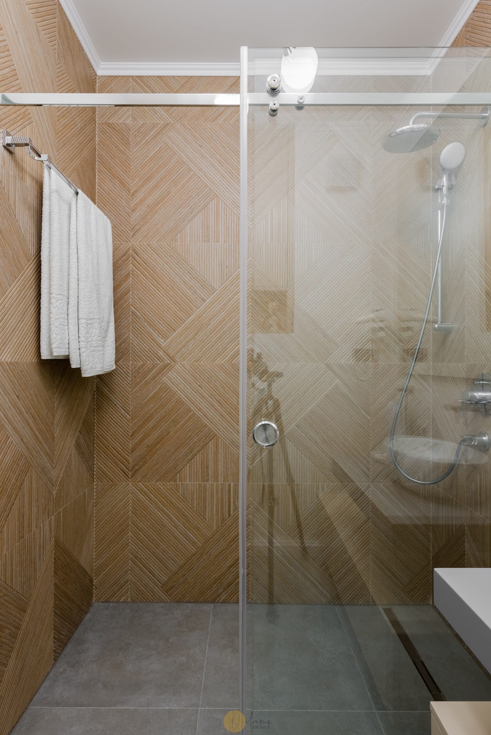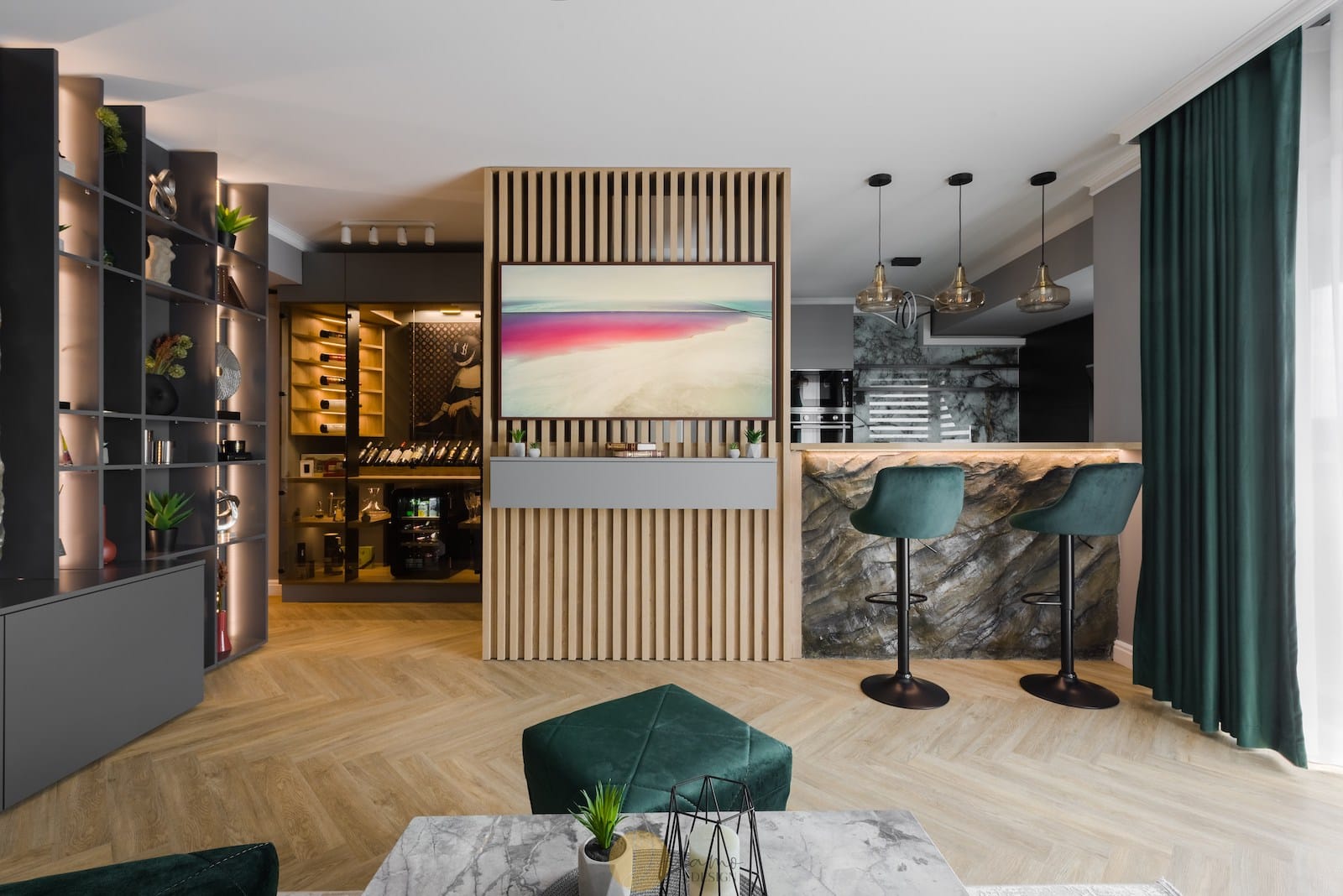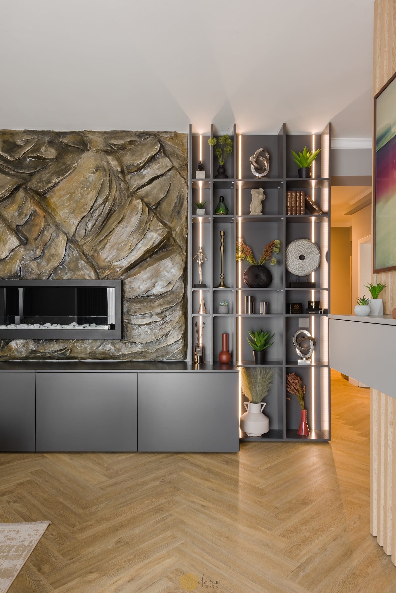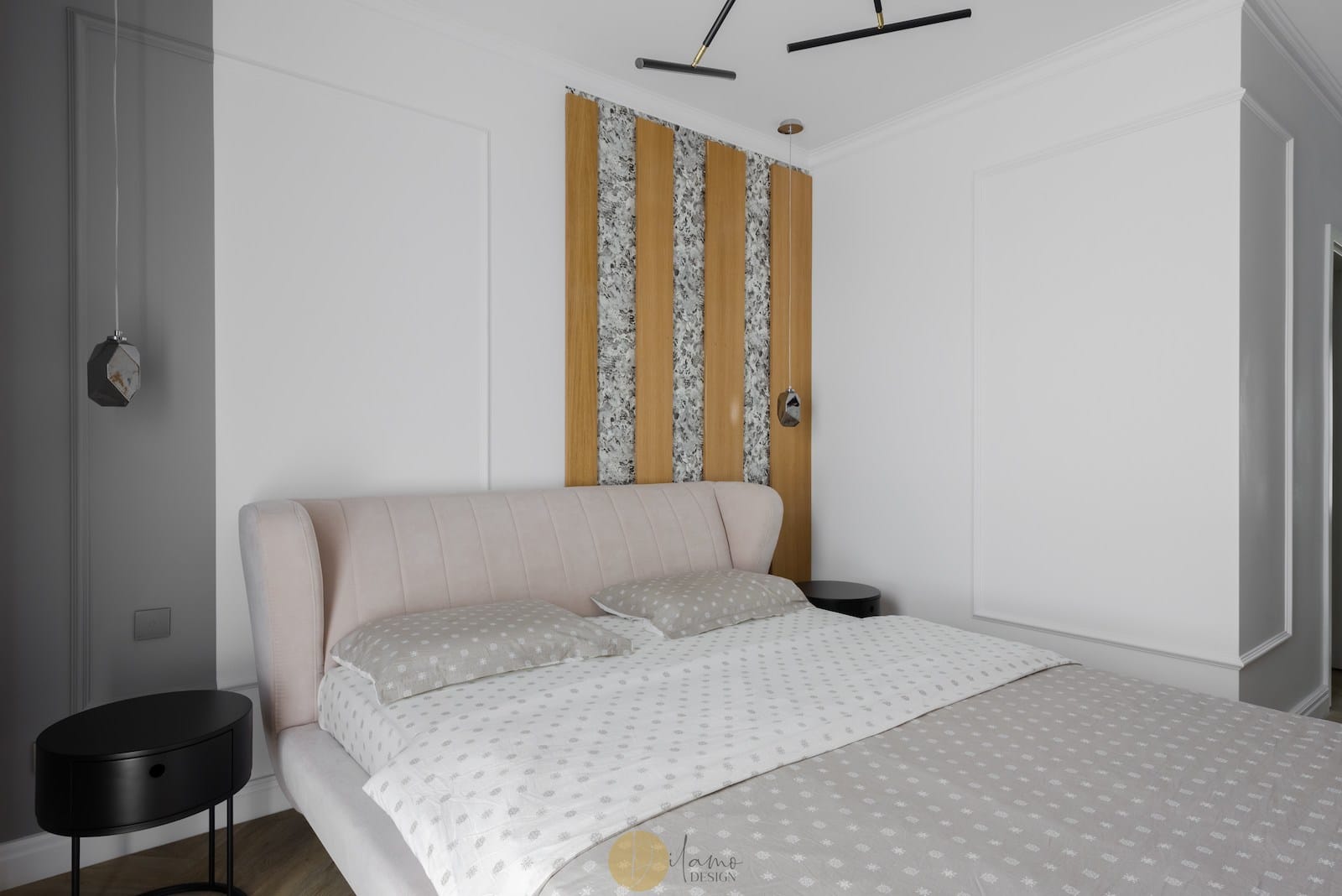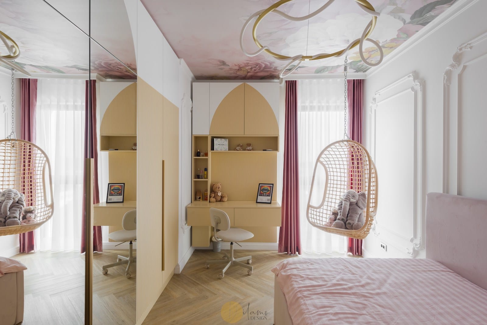 Combinația de elemente masculine avangardiste cu texturi calde și primitoare subliniază personalitatea unui tată puternic care împarte apartamentul cu fiica sa. Vinoteca și nuanțele puternice de negru și gri combinate cu naturalețea texturilor de lemn și a culorilor neutre creează un spațiu masculin, potrivit unui bărbat ce apreciază vinurile fine. În același timp, dormitorul fetiței combină culori blânde și feminine cu obiecte decorative unice și un tavan deosebit cu accente florale, construind astfel o atmosferă de feerie care invită la imaginație și conturează un spațiu protector.