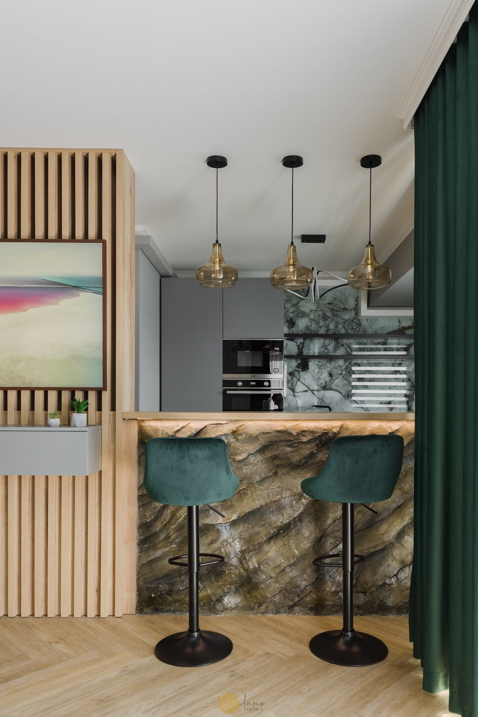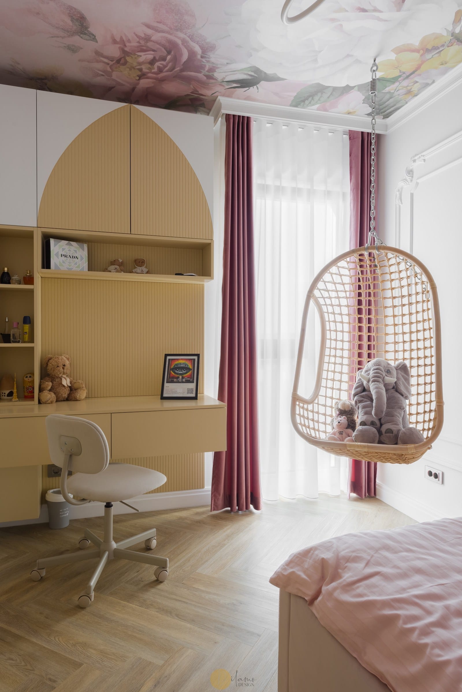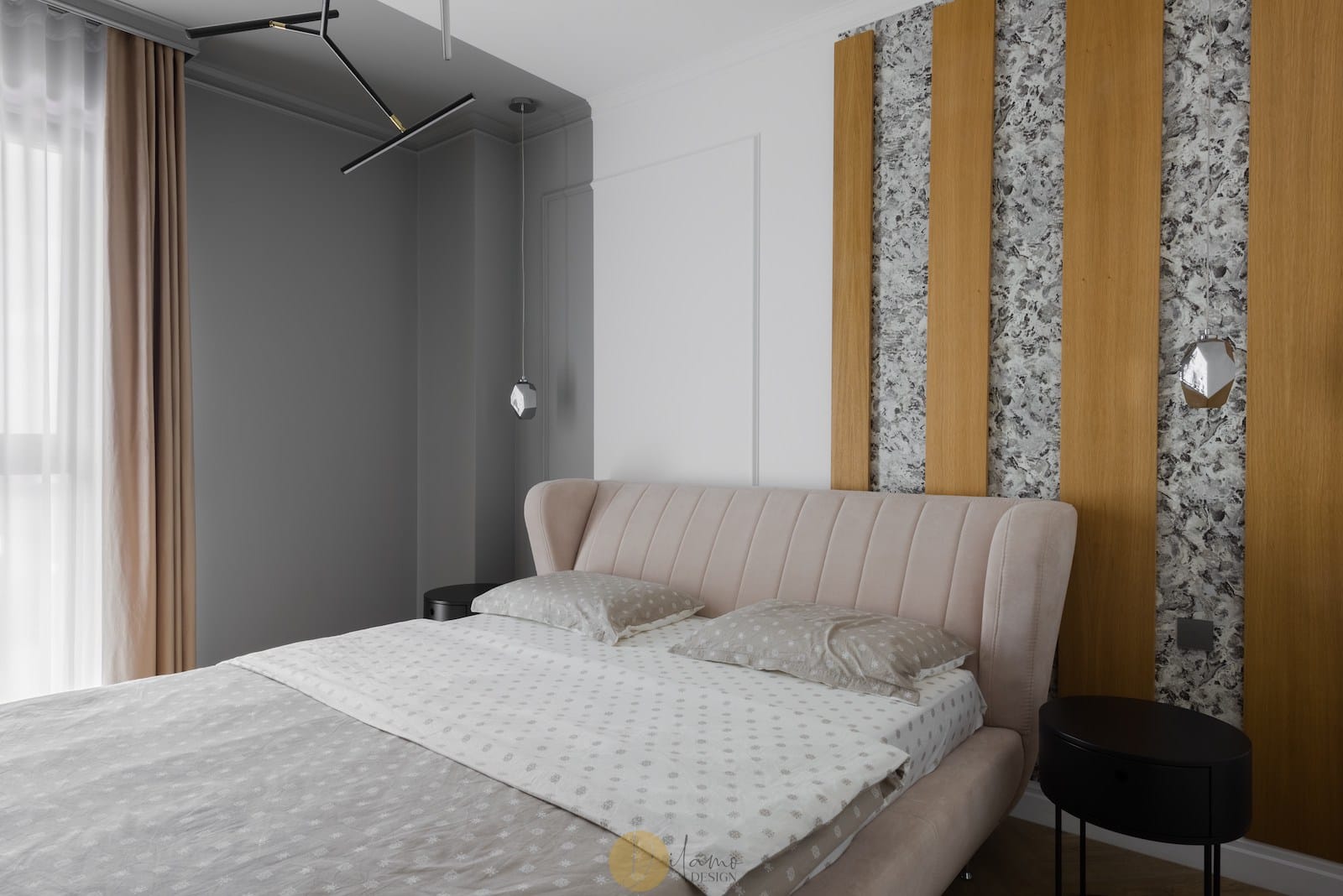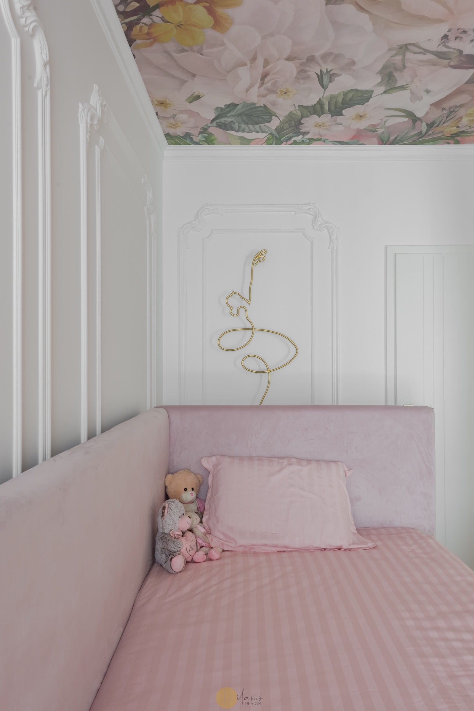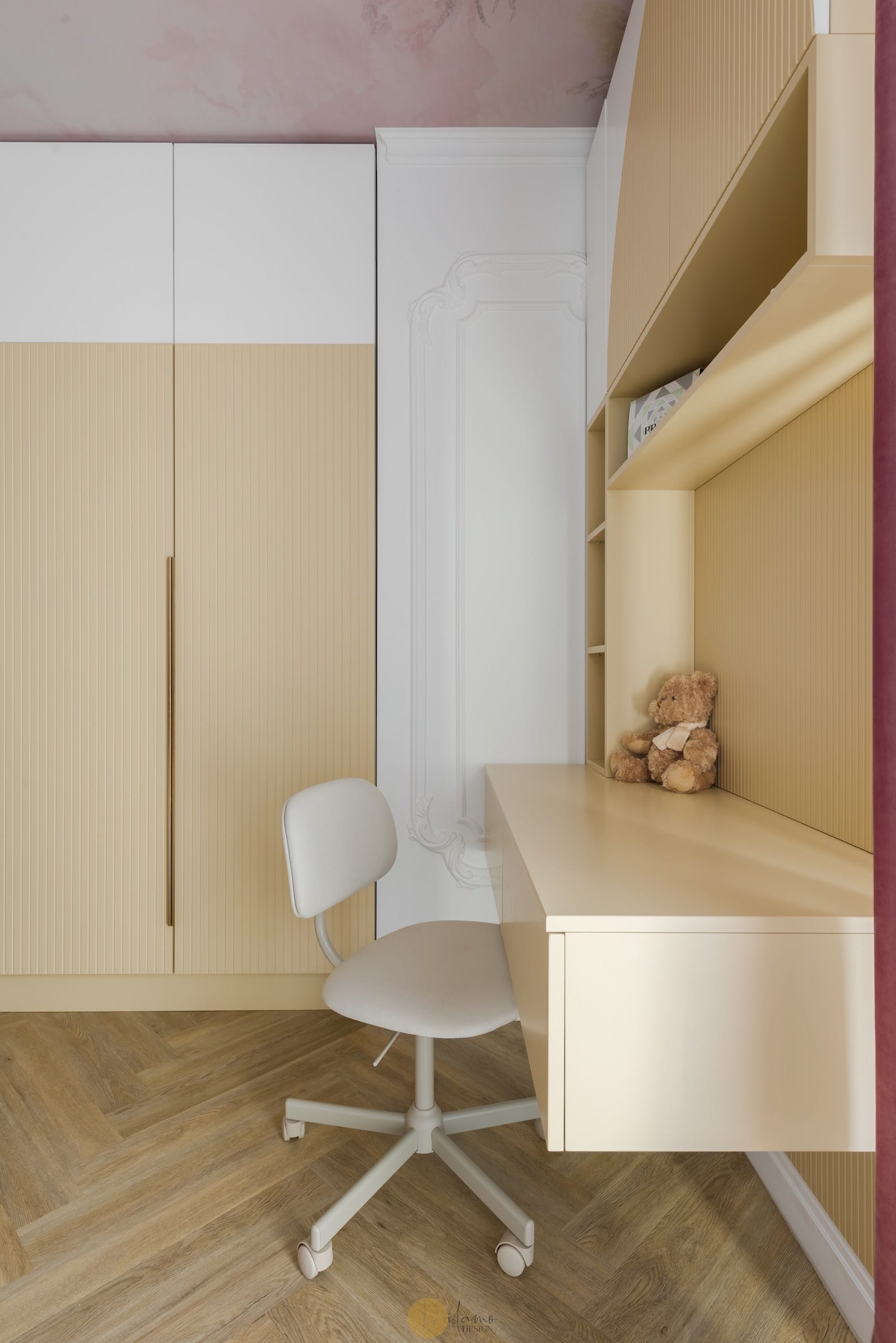 Combinația de elemente masculine avangardiste cu texturi calde și primitoare subliniază personalitatea unui tată puternic care împarte apartamentul cu fiica sa. Vinoteca și nuanțele puternice de negru și gri combinate cu naturalețea texturilor de lemn și a culorilor neutre creează un spațiu masculin, potrivit unui bărbat ce apreciază vinurile fine. În același timp, dormitorul fetiței combină culori blânde și feminine cu obiecte decorative unice și un tavan deosebit cu accente florale, construind astfel o atmosferă de feerie care invită la imaginație și conturează un spațiu protector.
