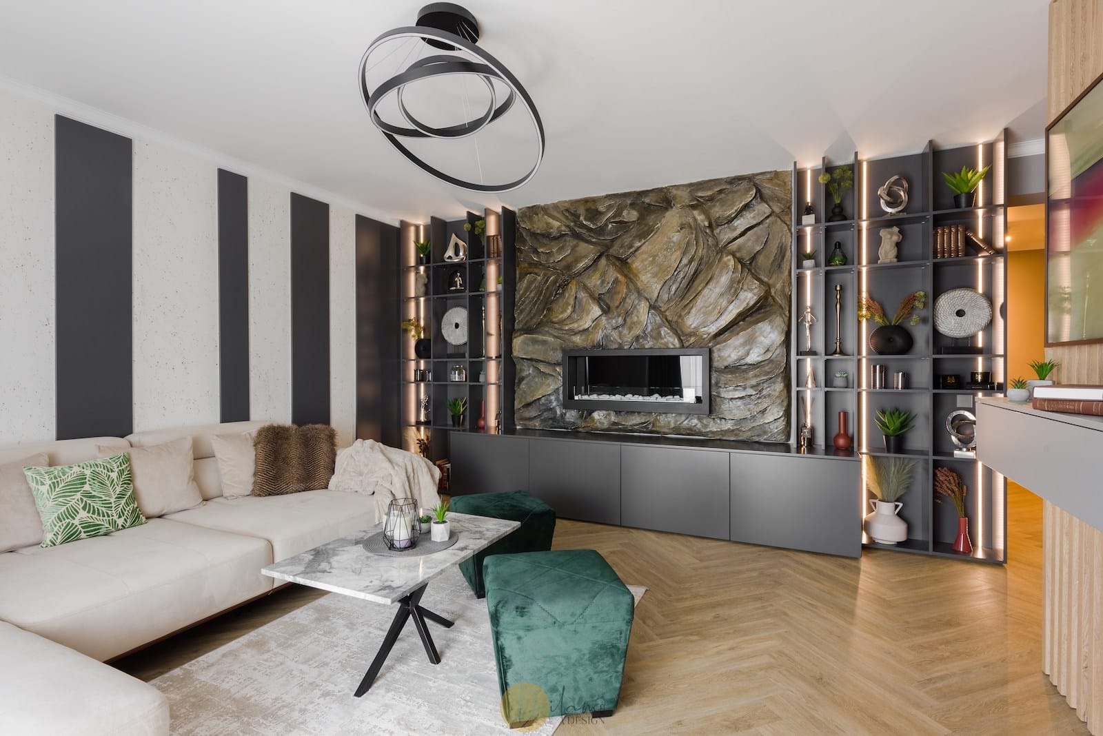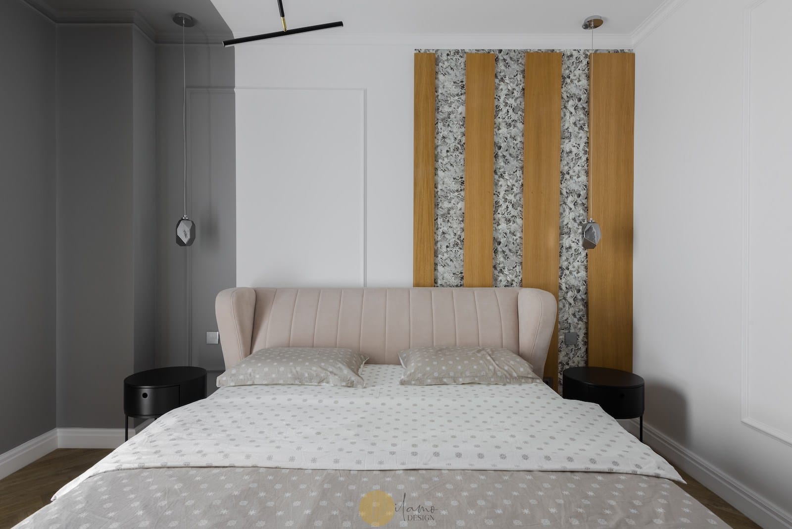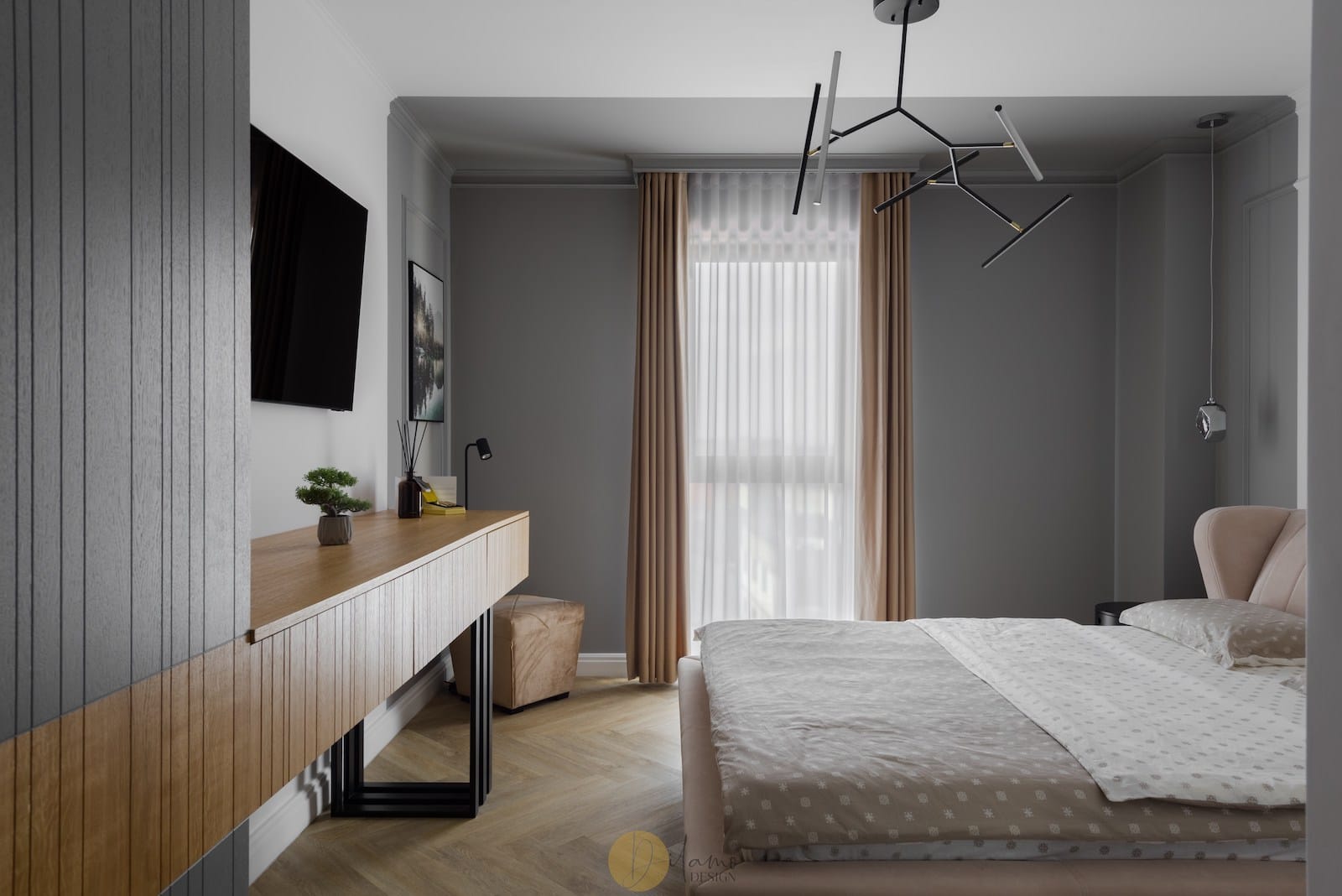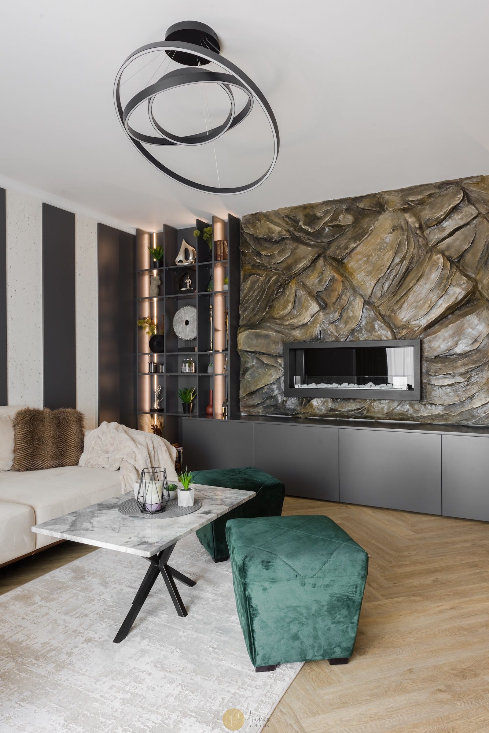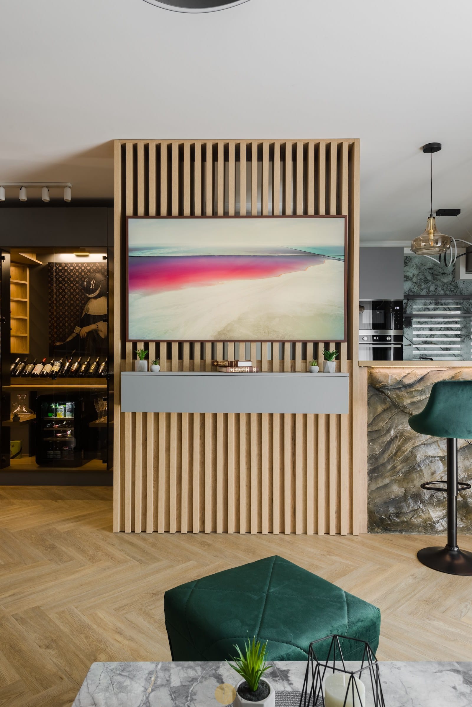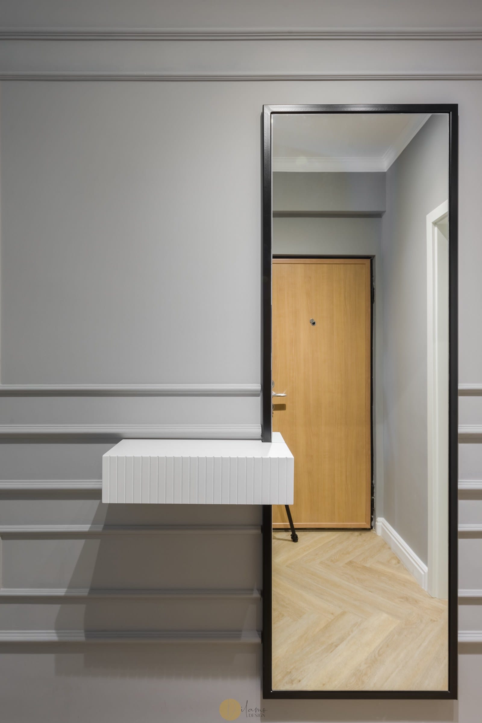 Combinația de elemente masculine avangardiste cu texturi calde și primitoare subliniază personalitatea unui tată puternic care împarte apartamentul cu fiica sa. Vinoteca și nuanțele puternice de negru și gri combinate cu naturalețea texturilor de lemn și a culorilor neutre creează un spațiu masculin, potrivit unui bărbat ce apreciază vinurile fine. În același timp, dormitorul fetiței combină culori blânde și feminine cu obiecte decorative unice și un tavan deosebit cu accente florale, construind astfel o atmosferă de feerie care invită la imaginație și conturează un spațiu protector.
