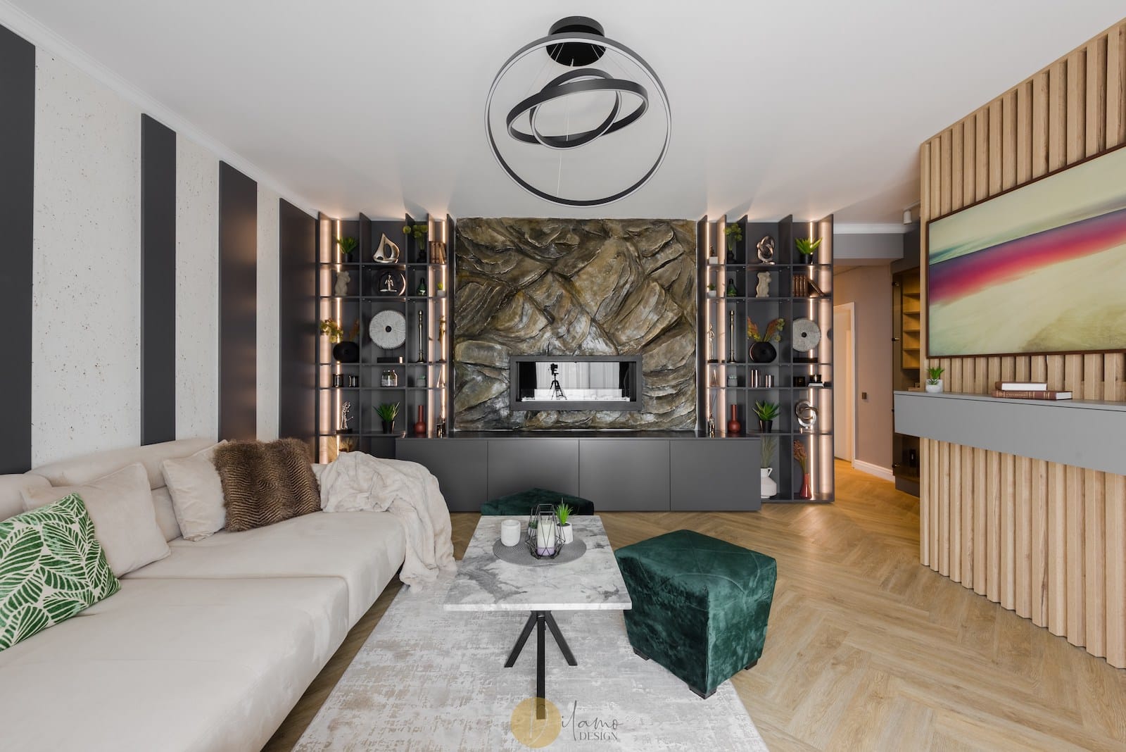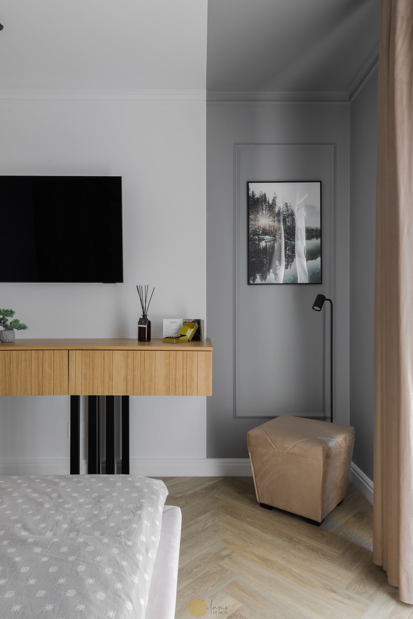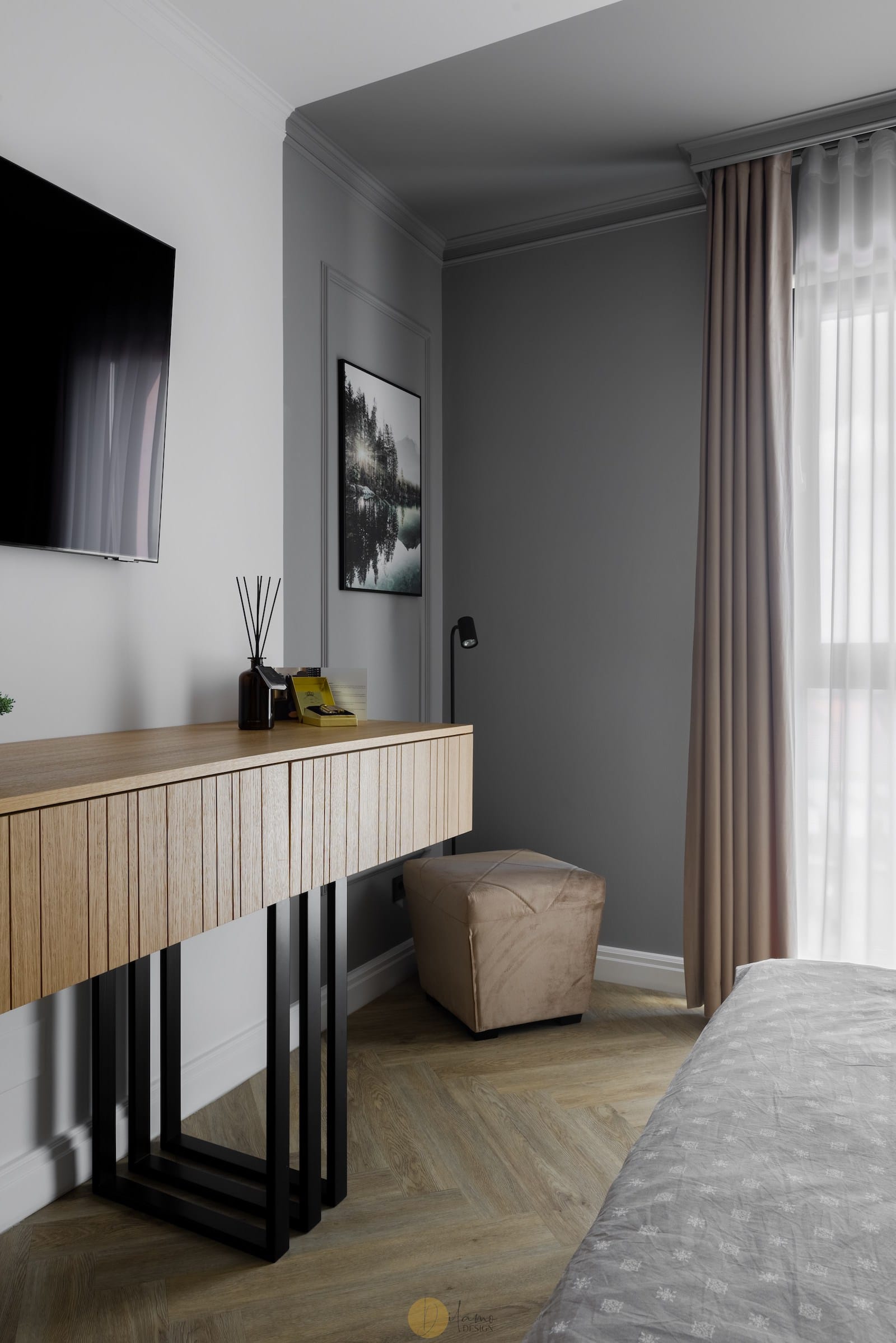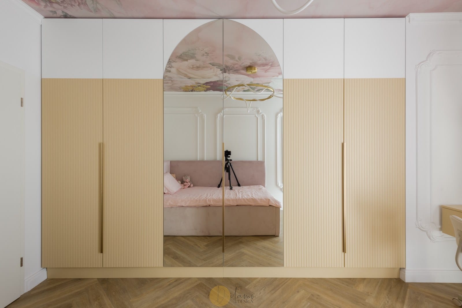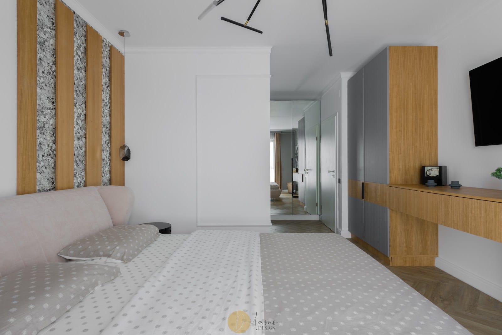 Combinația de elemente masculine avangardiste cu texturi calde și primitoare subliniază personalitatea unui tată puternic care împarte apartamentul cu fiica sa. Vinoteca și nuanțele puternice de negru și gri combinate cu naturalețea texturilor de lemn și a culorilor neutre creează un spațiu masculin, potrivit unui bărbat ce apreciază vinurile fine. În același timp, dormitorul fetiței combină culori blânde și feminine cu obiecte decorative unice și un tavan deosebit cu accente florale, construind astfel o atmosferă de feerie care invită la imaginație și conturează un spațiu protector.