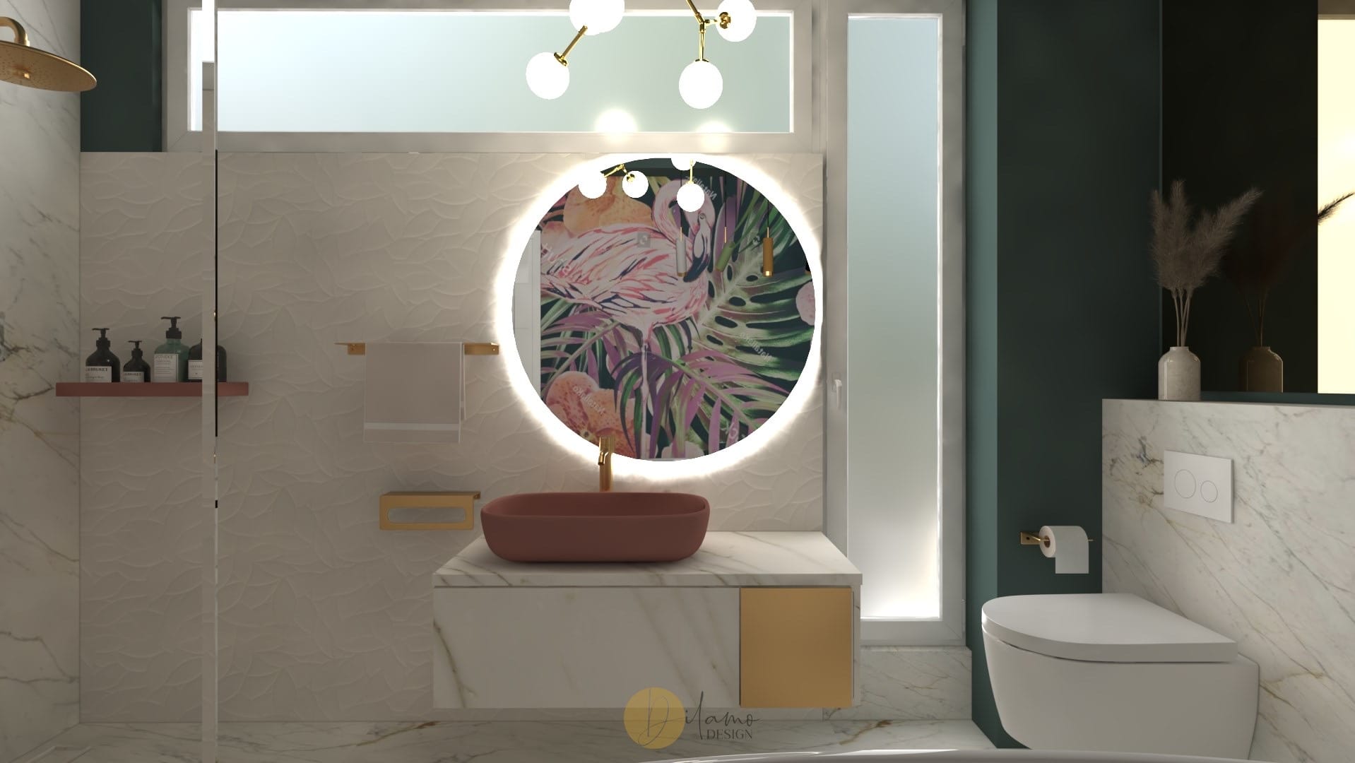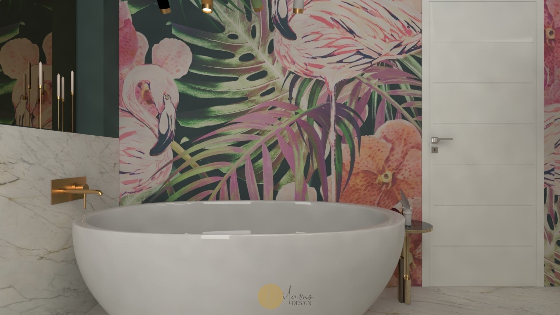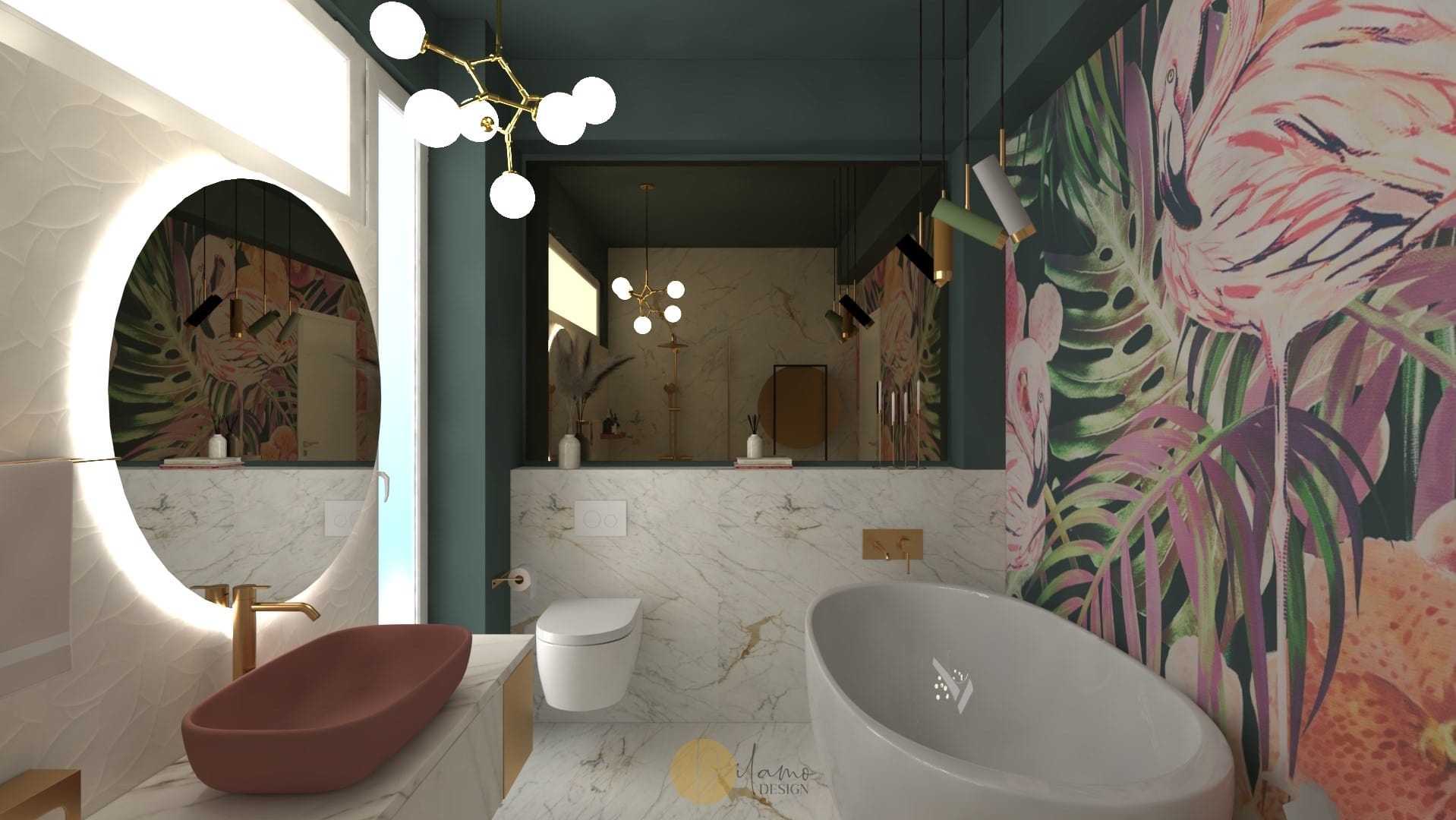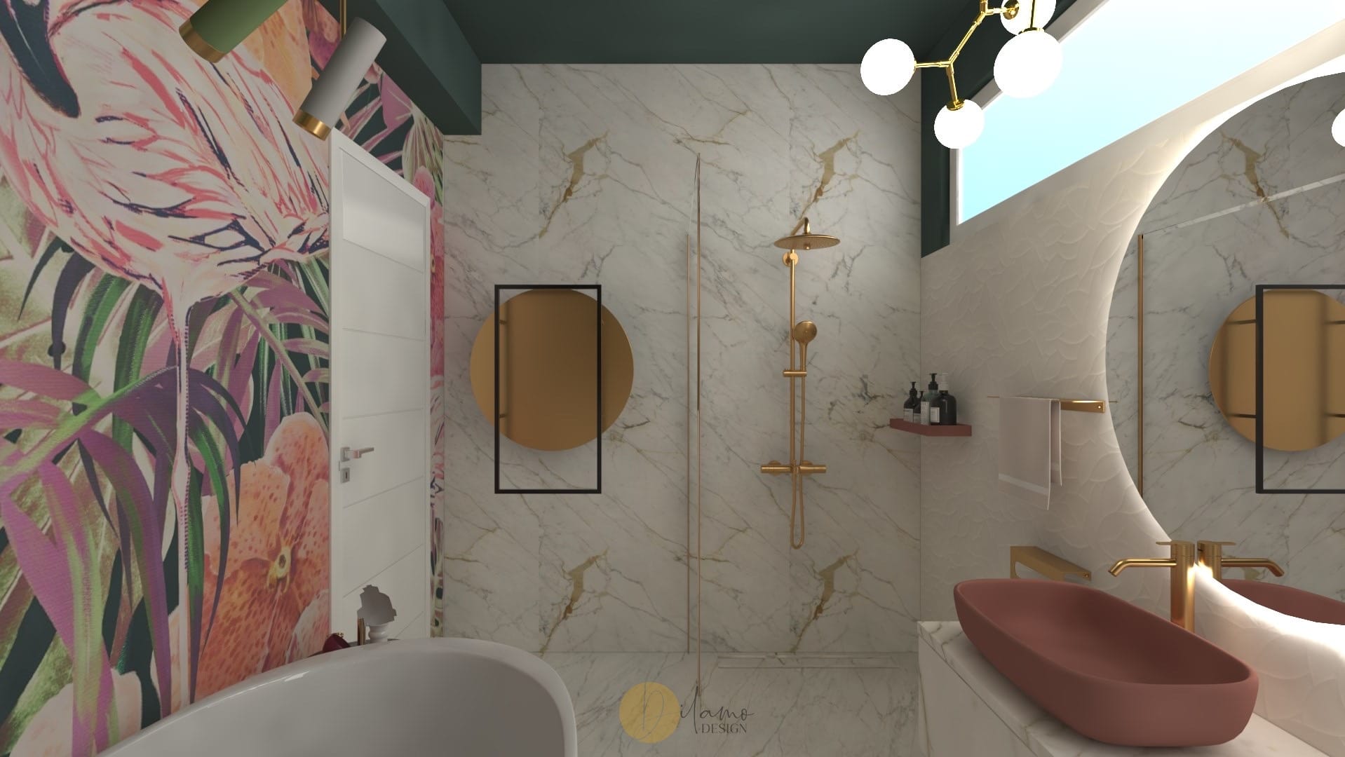 Marea si natura au fost inspiratia principala pentru acest proiect denumit de echipa noastra drept “tropical house”. Astfel, combinatiile eclectice sunt elementele principale care scot aceasta casa in evidenta. Tapeturile florale si tropicale utilizate pe peretii verticali, dar si pe tavan subliniaza personalitatea colorata a proprietarilor. De asemenea, corpurile de iluminat hi-tech, texturile de marmura si elementele de decor in forme diverse traseaza directia pentru o casa cocheta si rafinata.