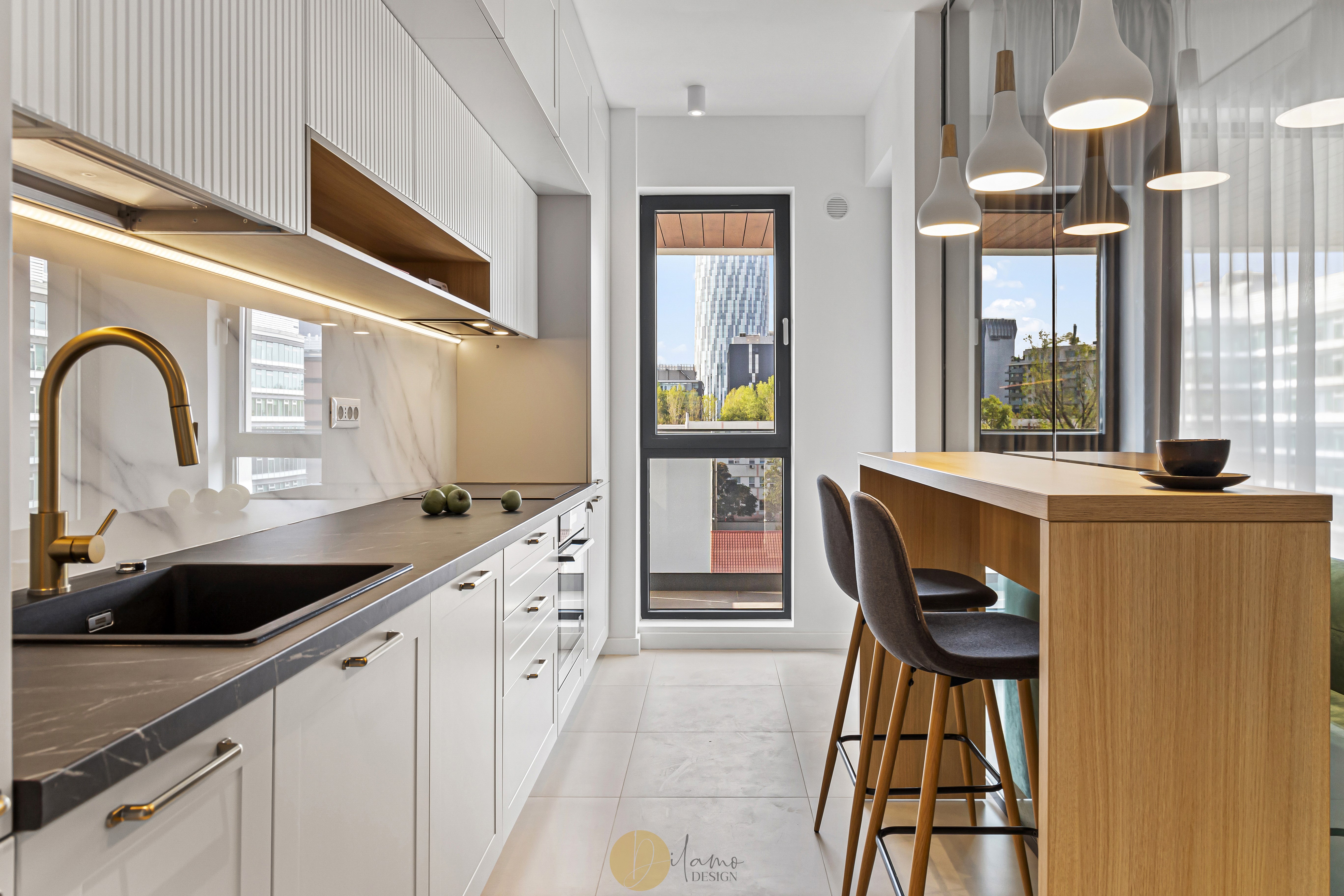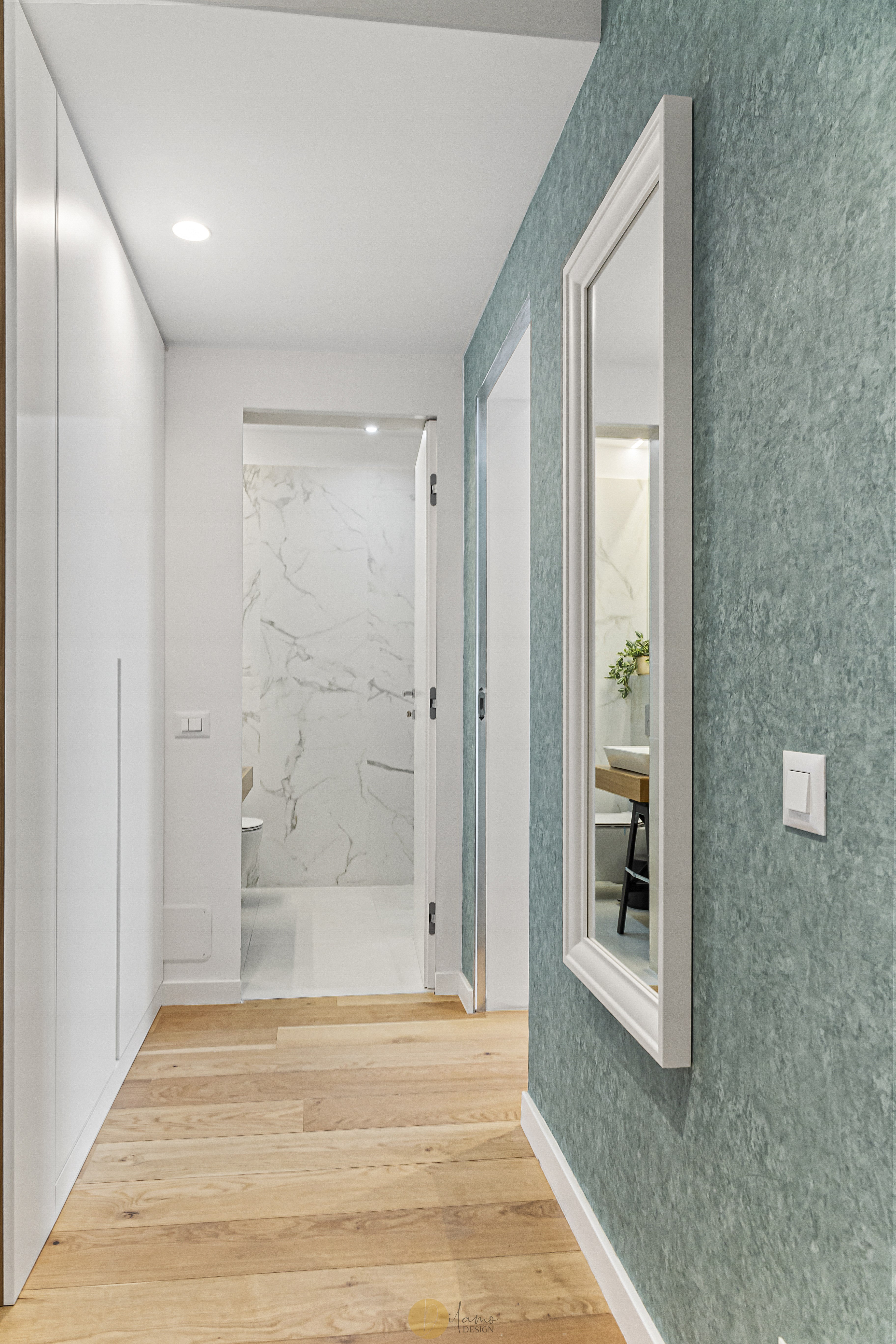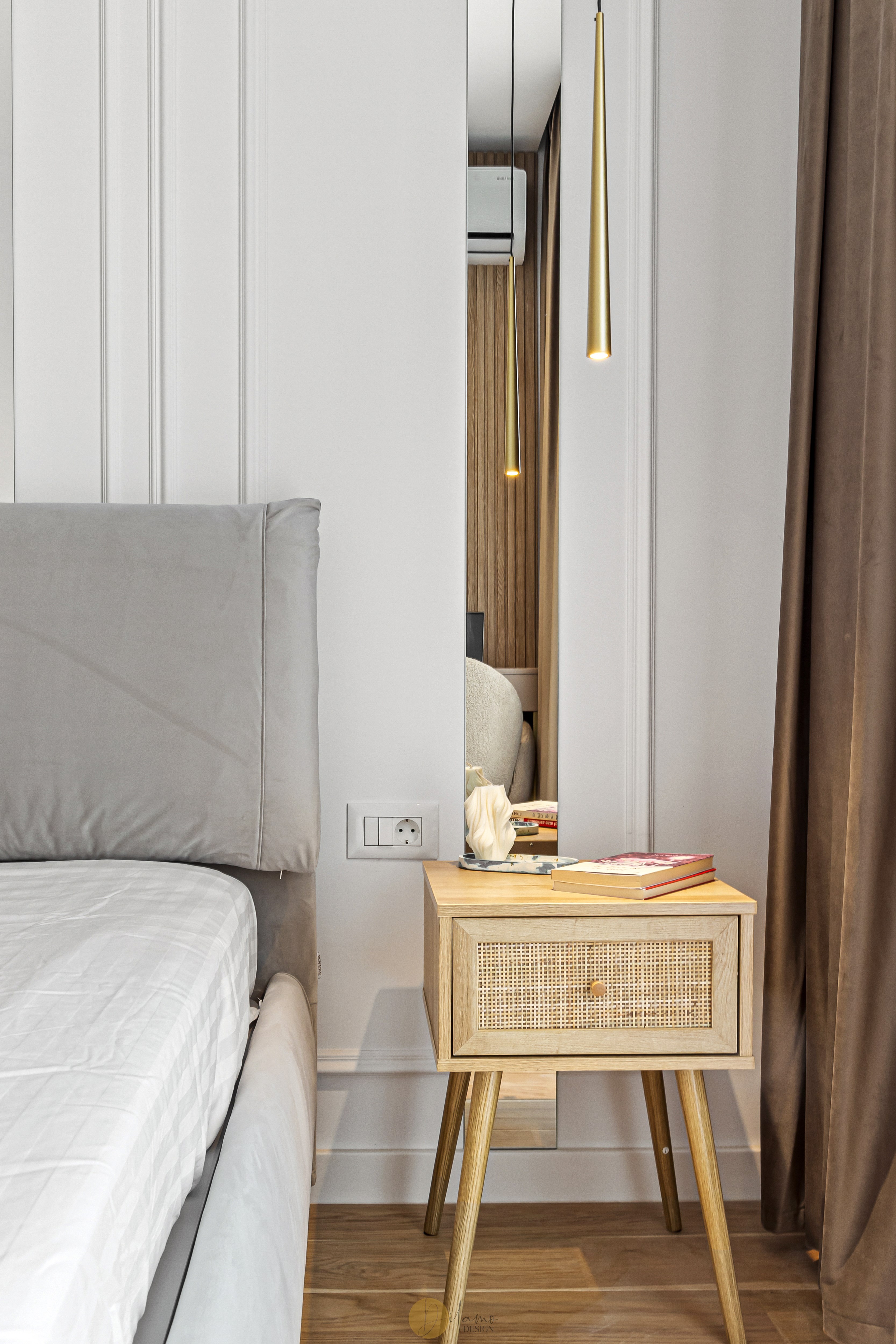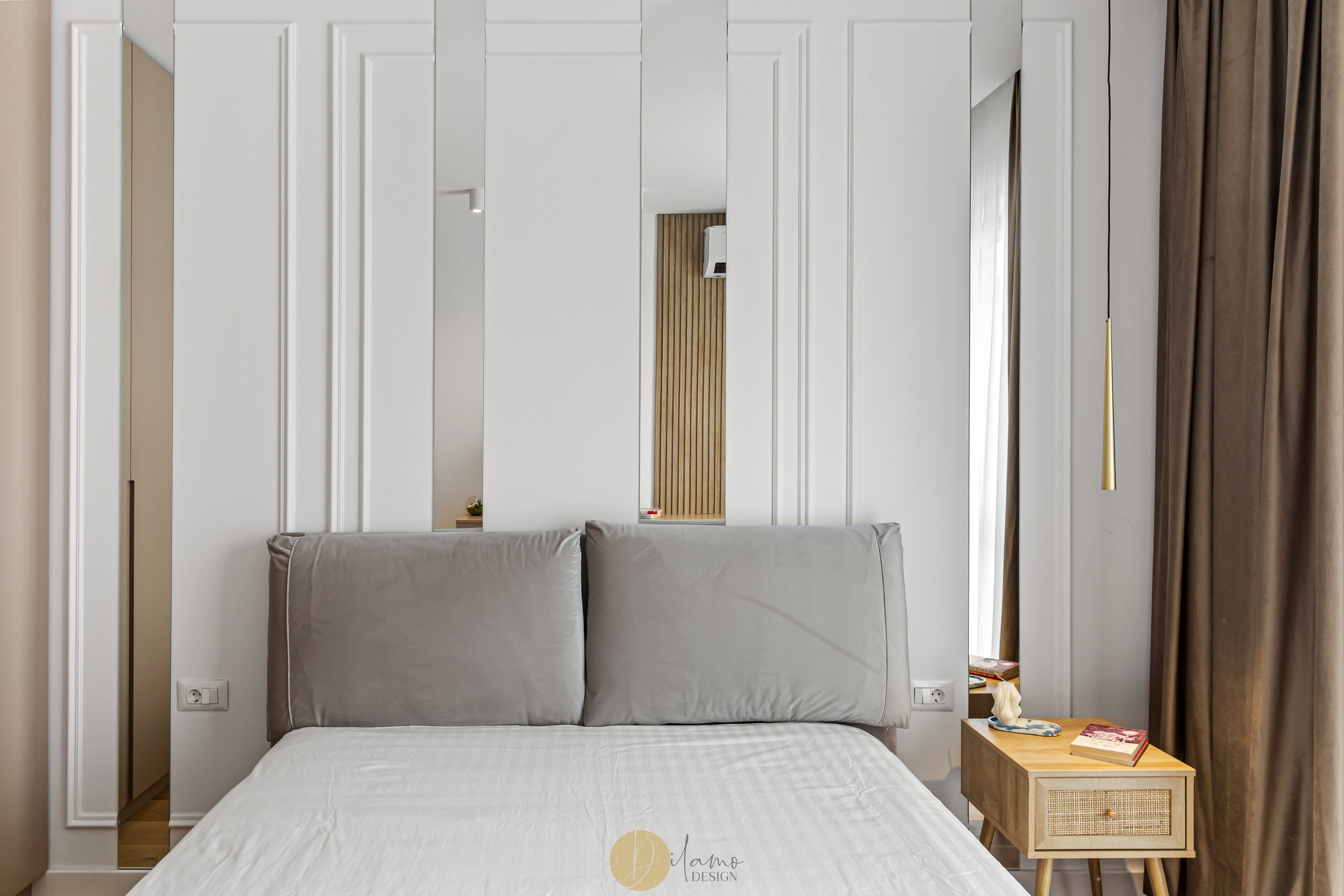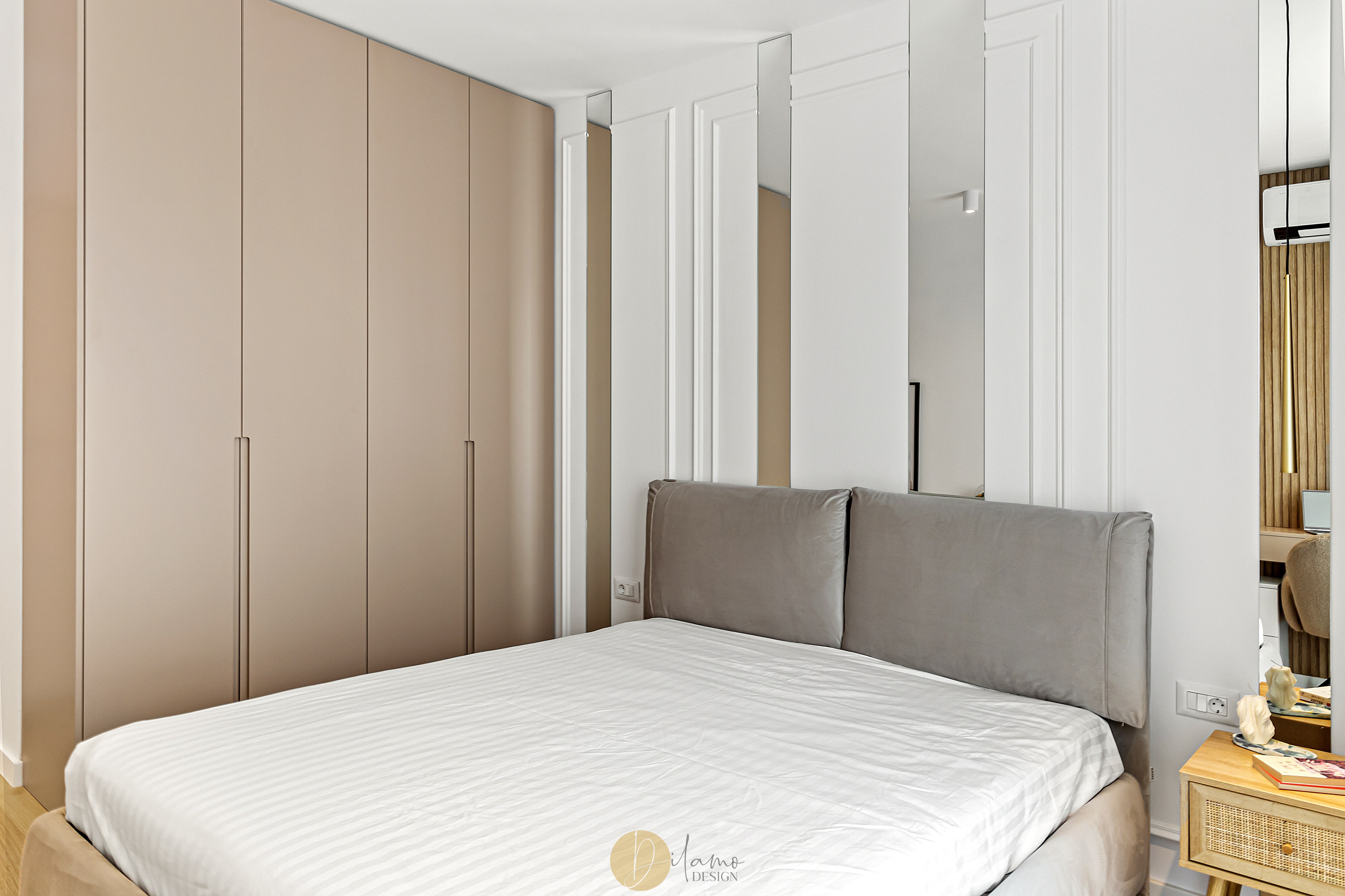 Zona de bucătărie este open space, cu un living generos, formând un ambient stilat. Ajungem în camera de noapte, dormitorul propune o serie de tonuri mai calde, bejuri, roz pudrat, care pleacă din sfera rece într-un ambient mai cald. Patul privește spre o mică zonă cochetă personală cu oglindă, iar pereții au elemente decorative foarte fine pentru un look premium.
