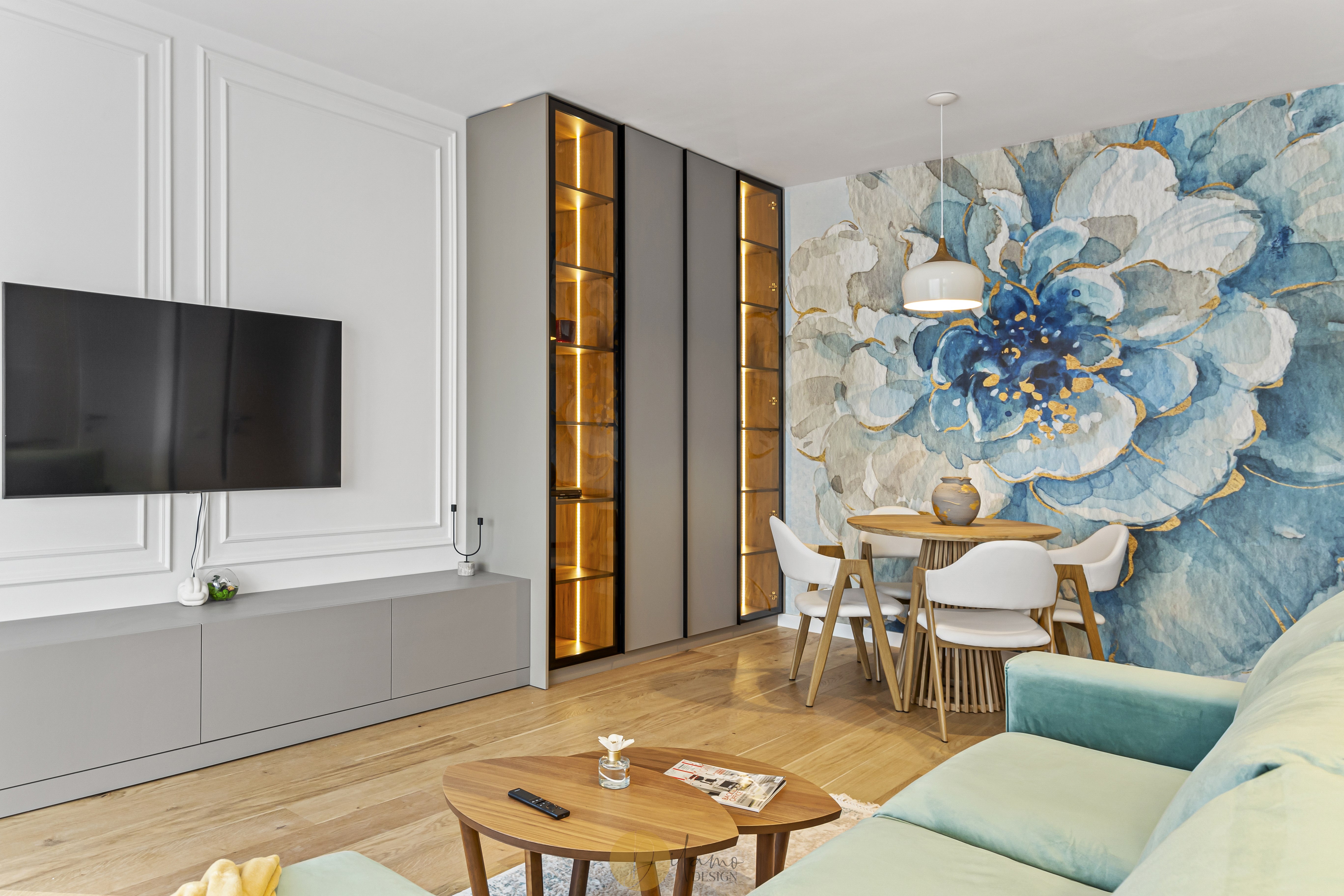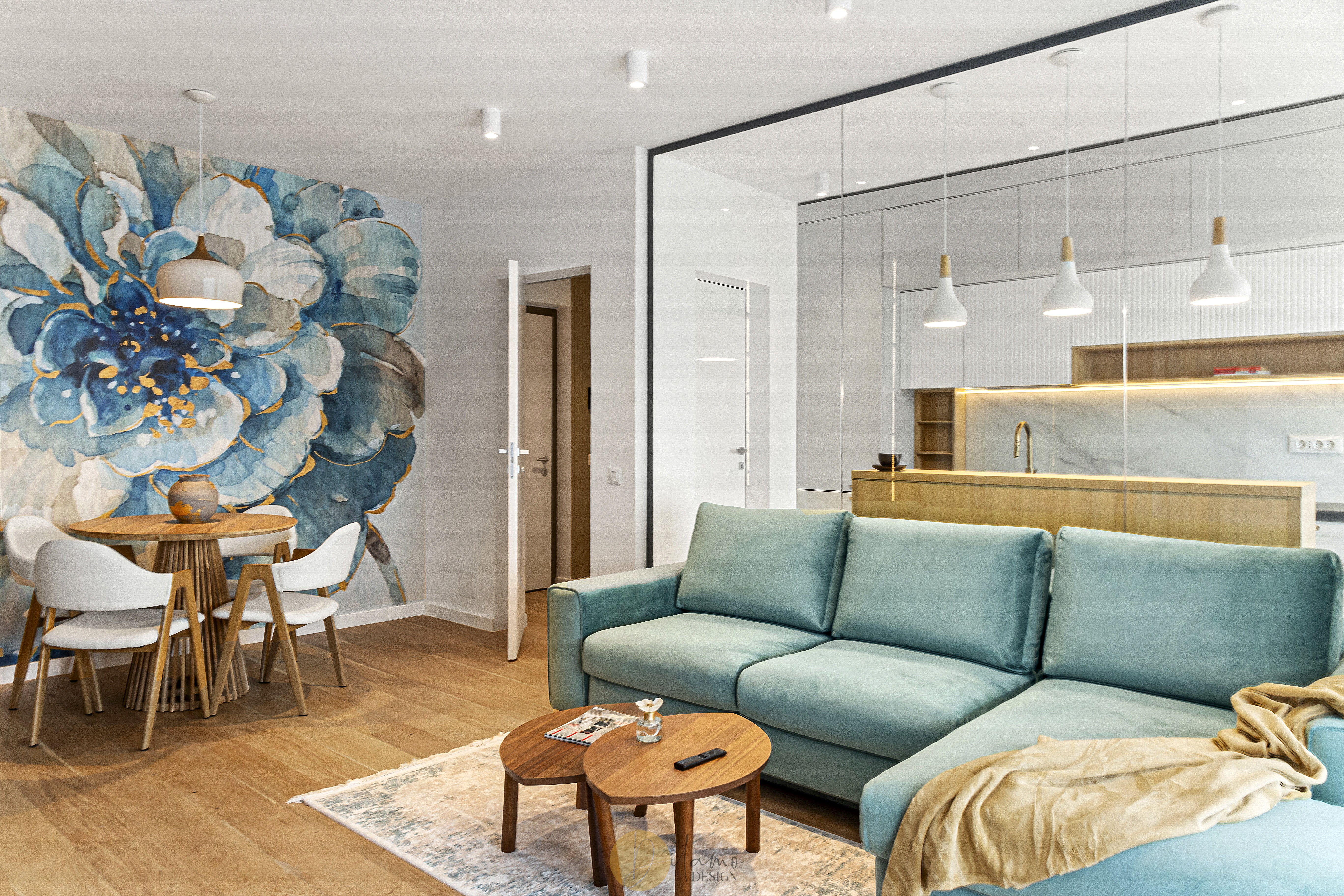 Lasă-te condus de frumusețea și delicatețea petalelor. Bine ai venit într-o nouă amenajare interioară Dilamo Design, într-un apartament intim, elegant și modern. Tonurile de alb, negru sunt puse în valoare de culoarea spectaculoasă a canapelei, care se potrivește cu tapetul decorativ elegant.