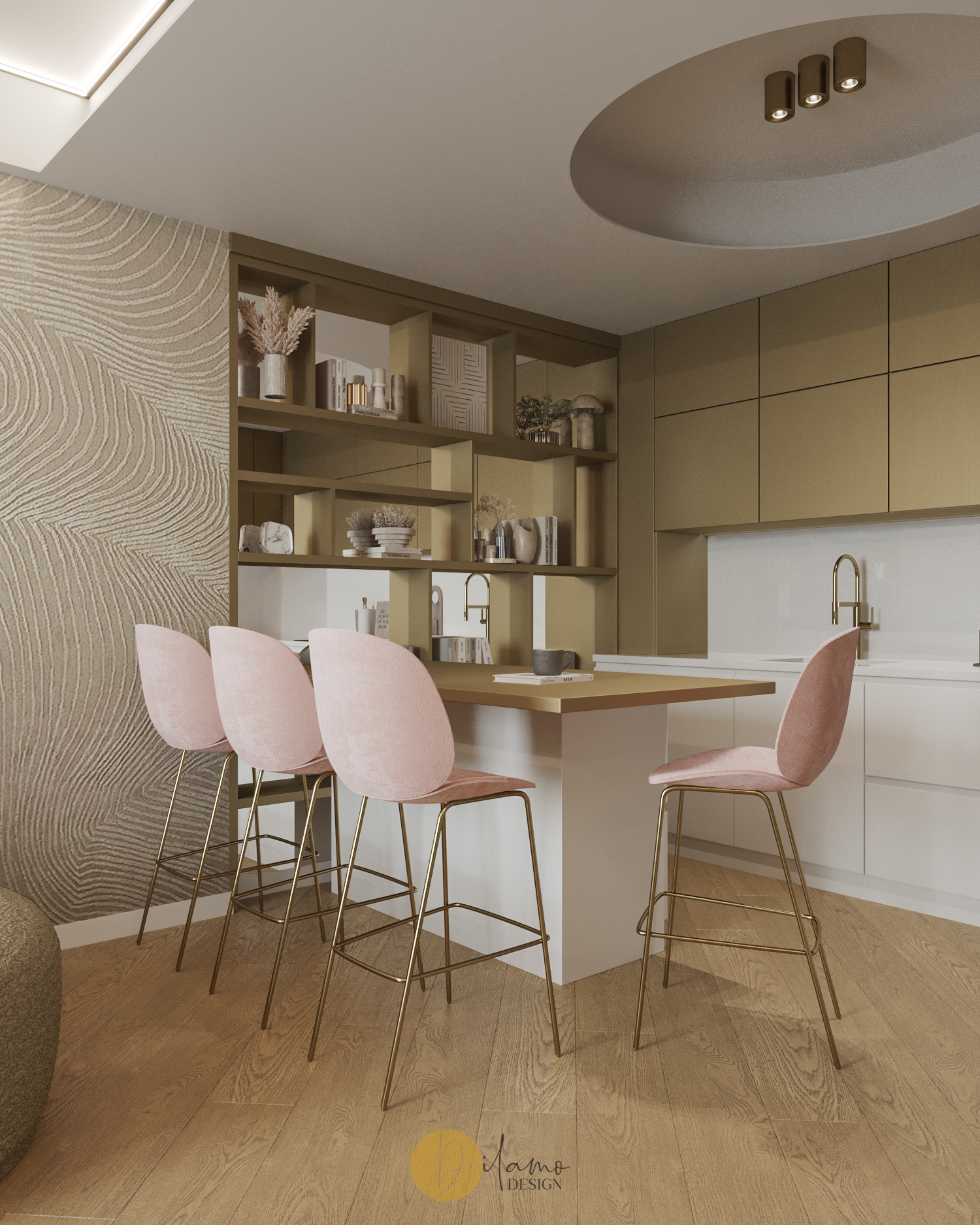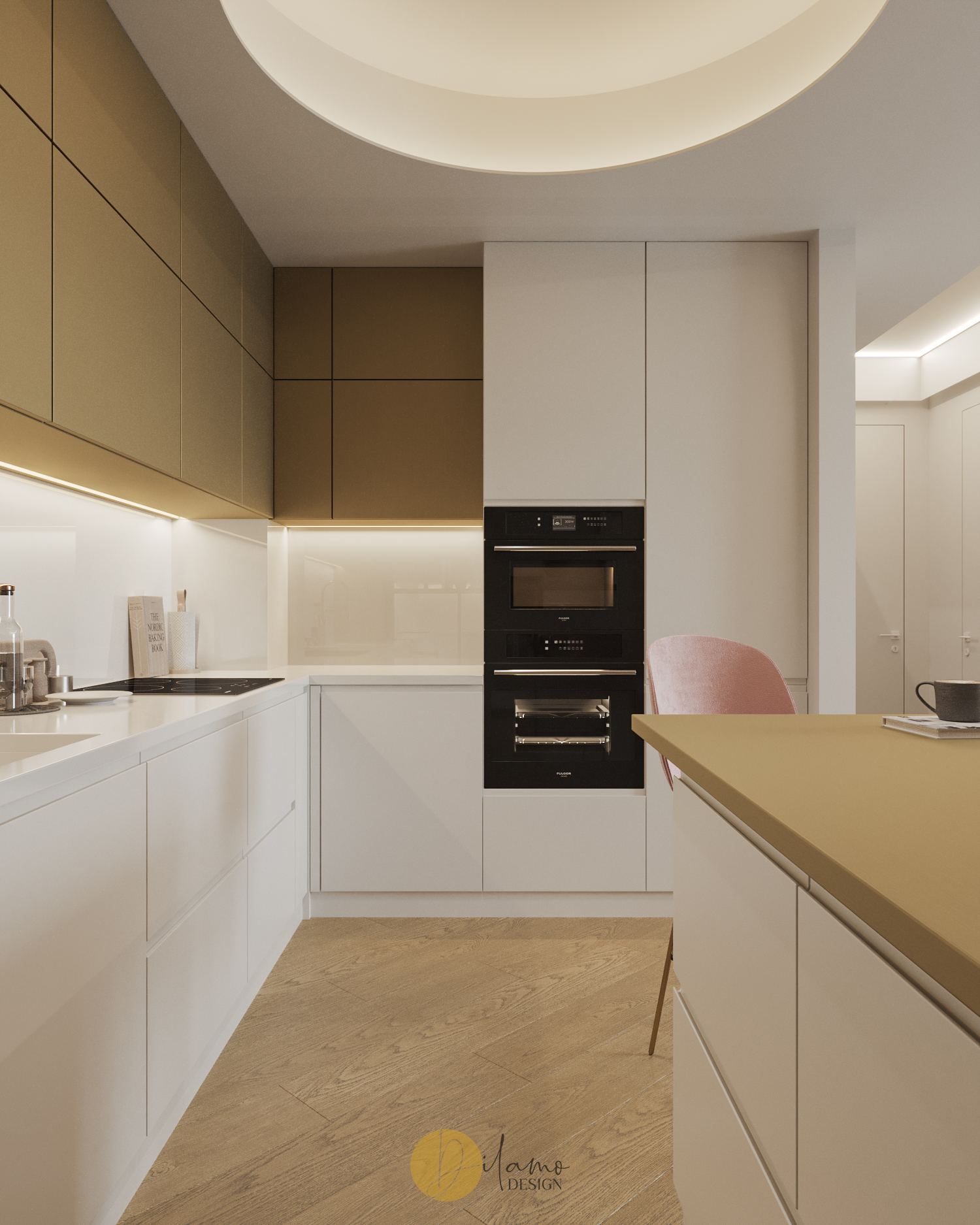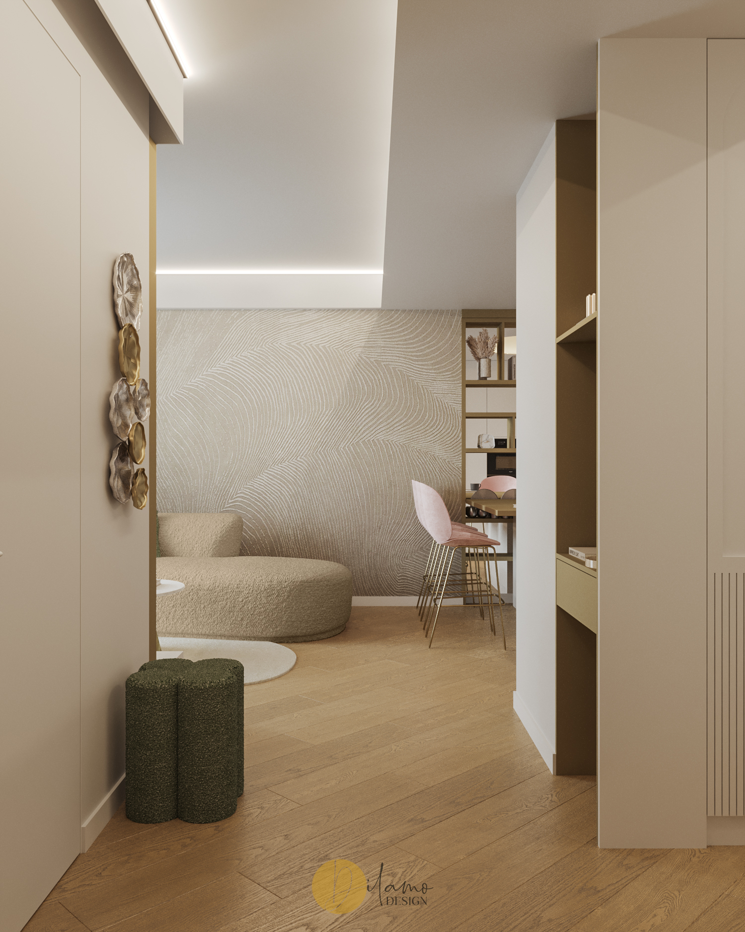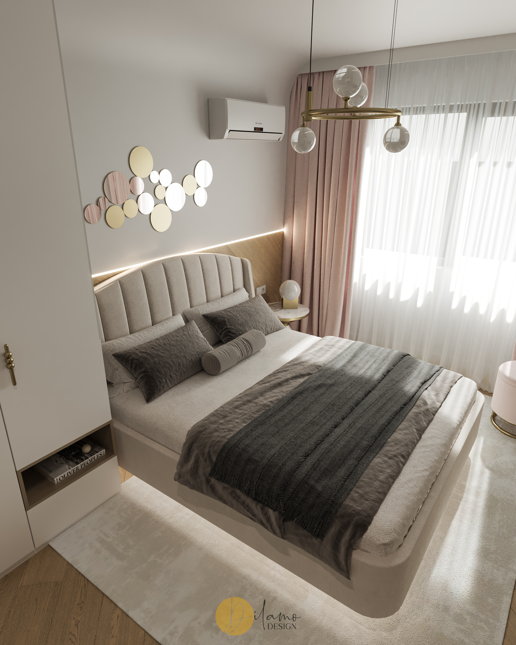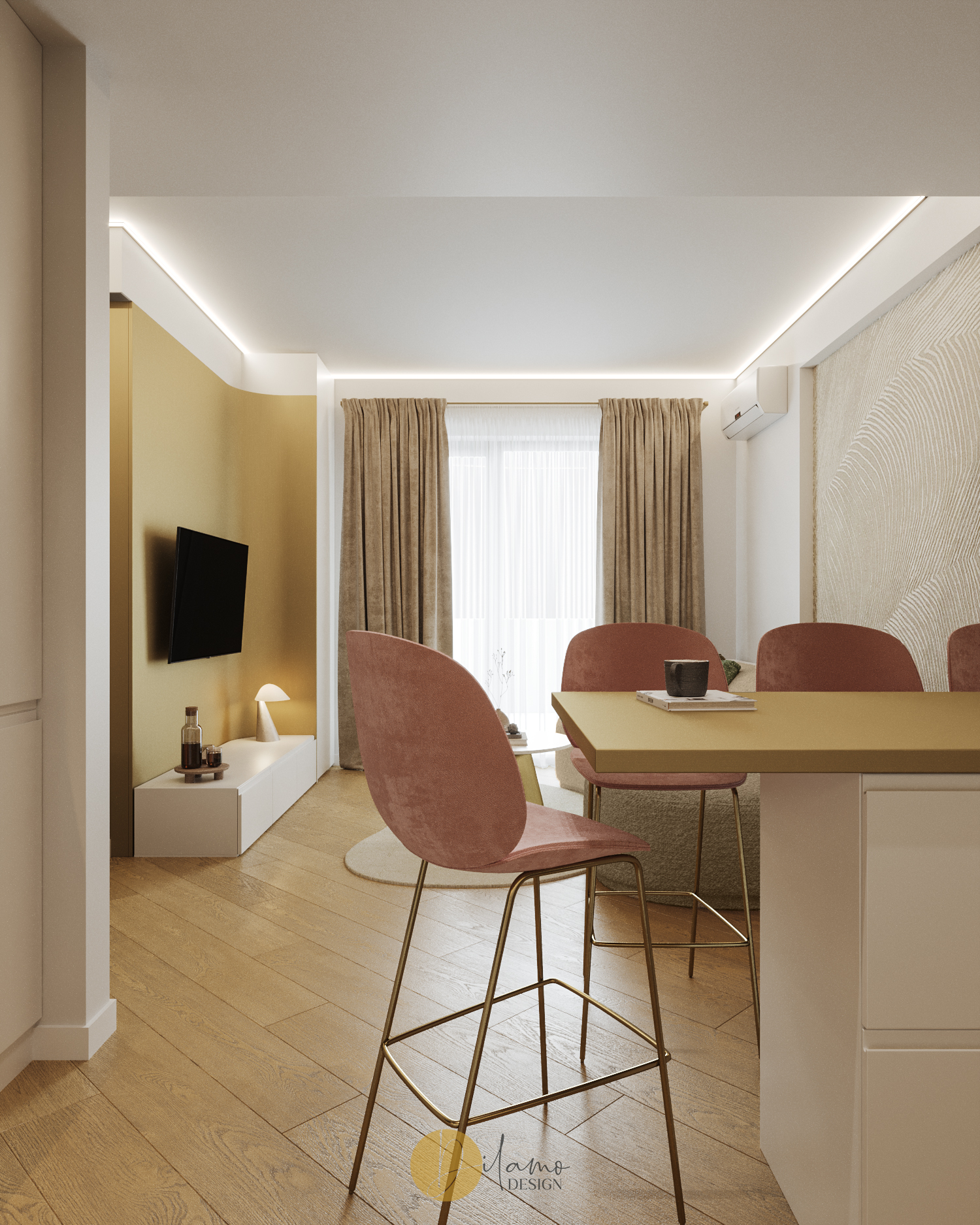 Te invităm într-un apartament chic, cochet, cu 2 camere, proiectat pentru un stil de viață activ și modern. Cromatica este veselă și primitoare, iar detaliile de auriu aduc un plus de rafinament amenajării Dilamo Design.