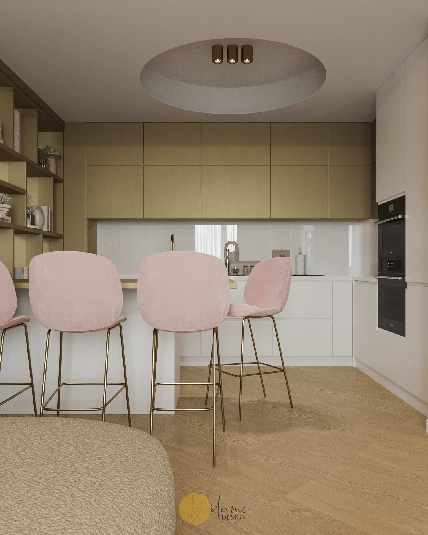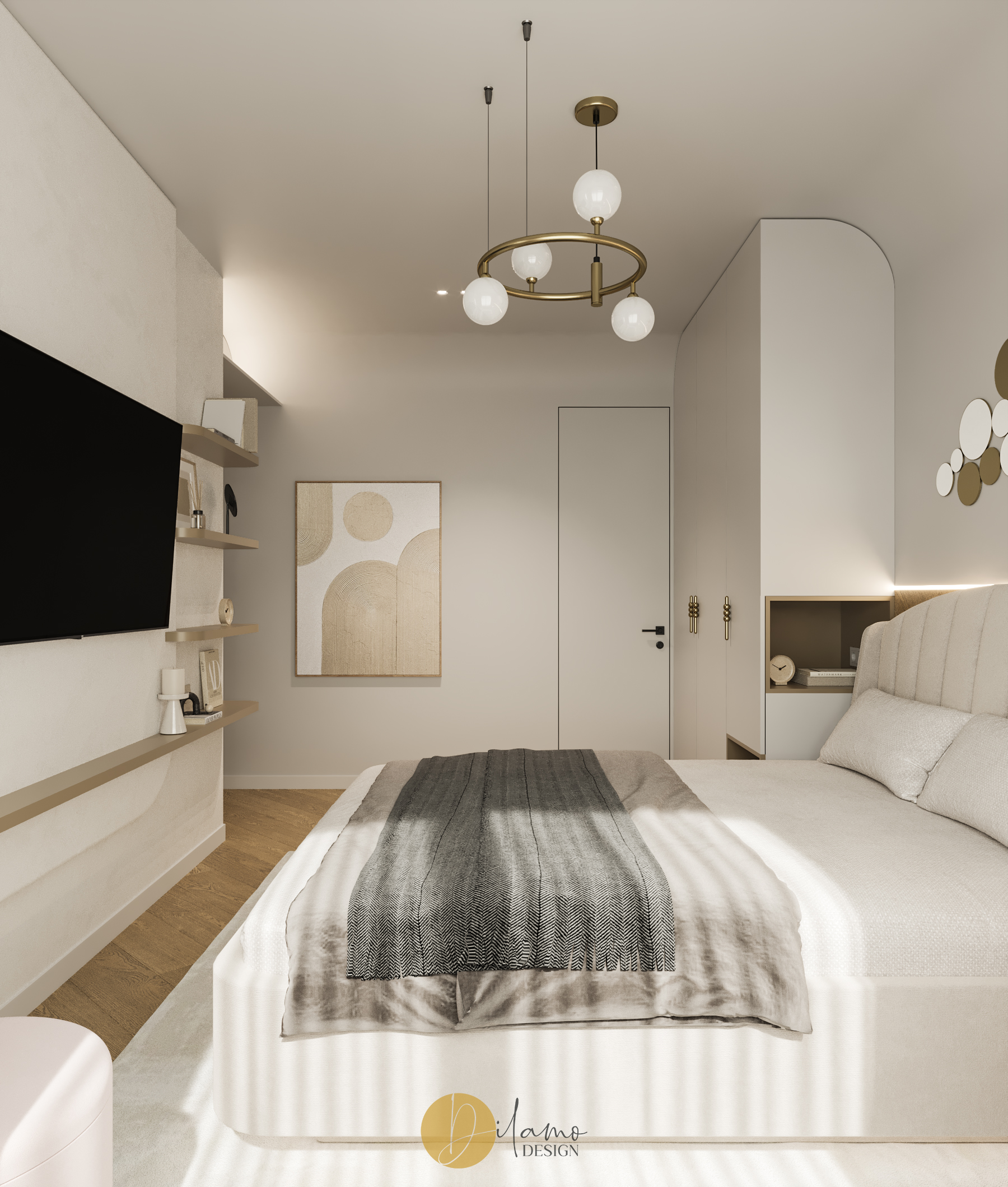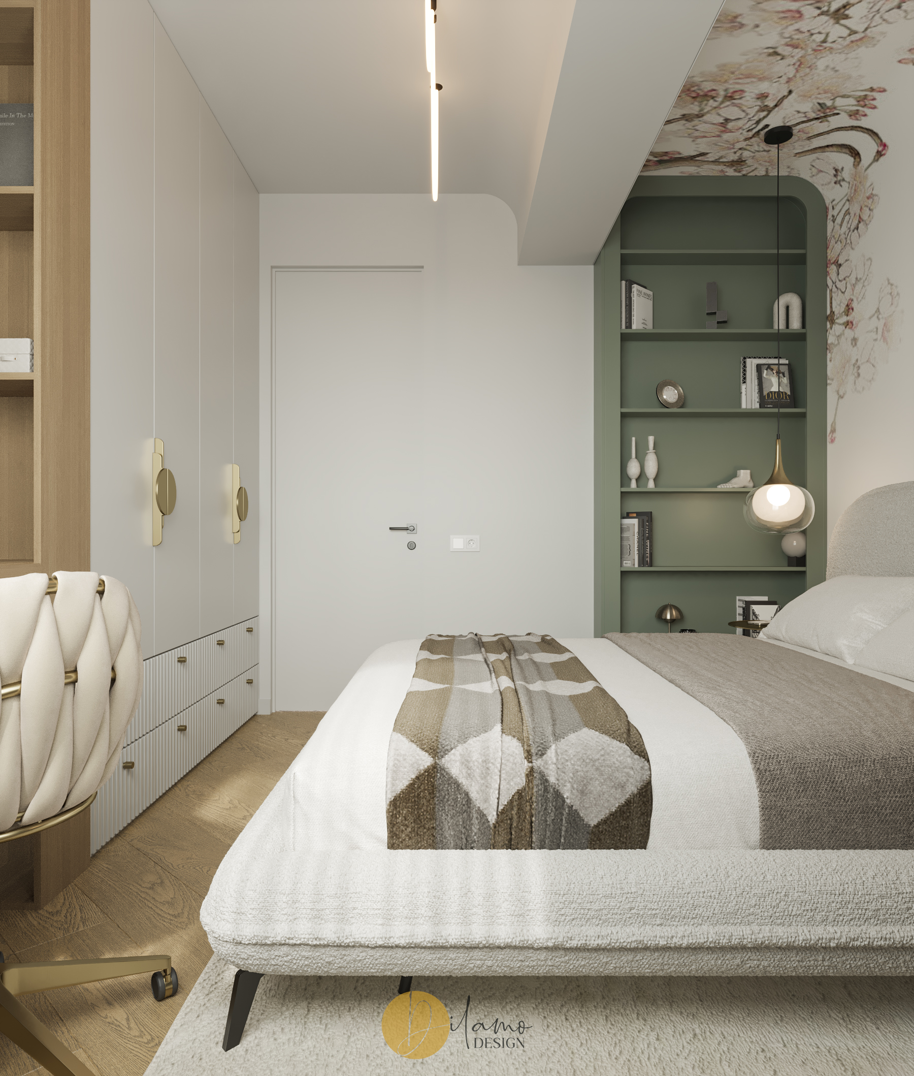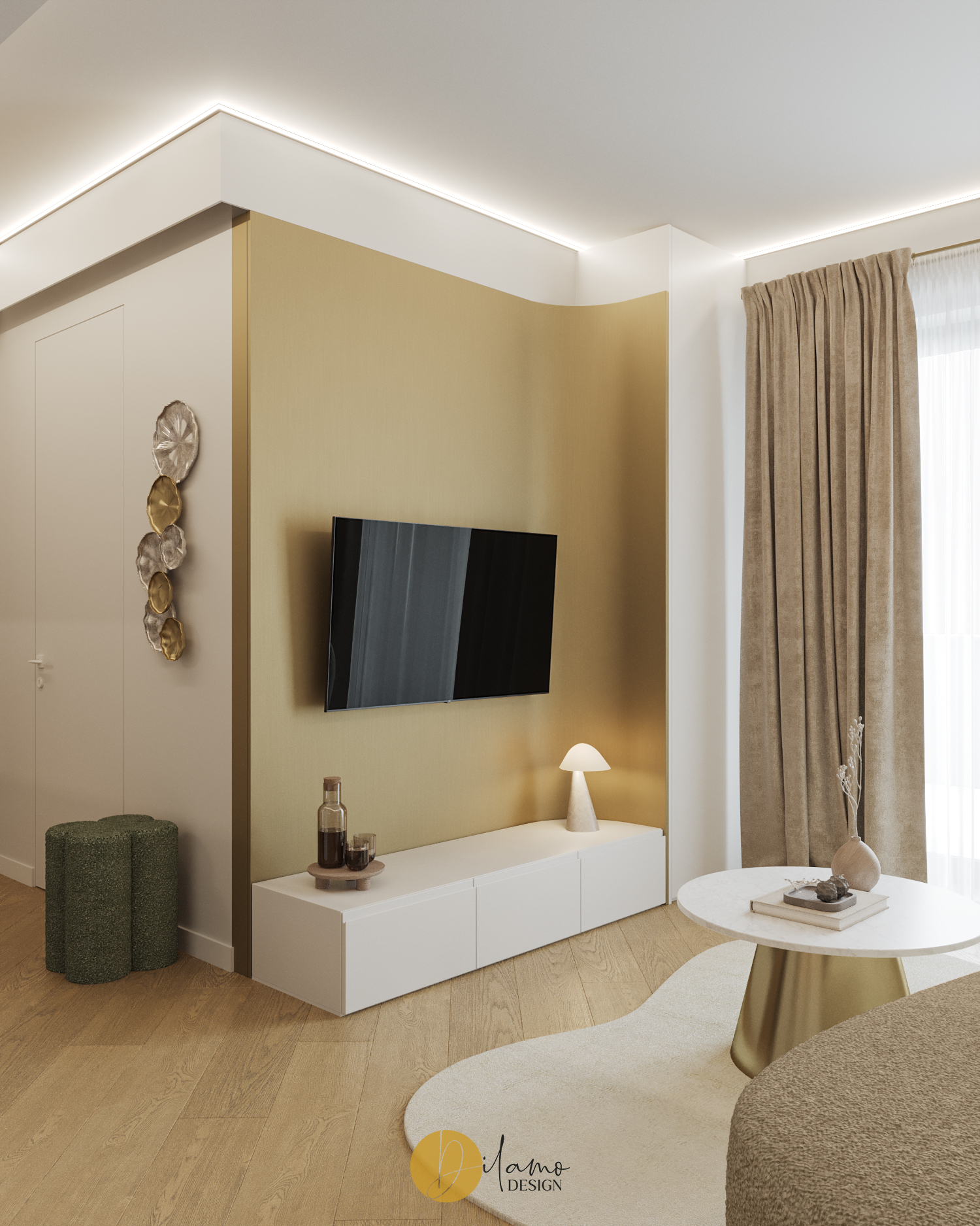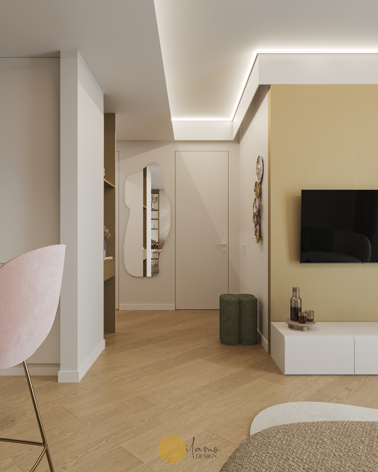 Te invităm într-un apartament chic, cochet, cu 2 camere, proiectat pentru un stil de viață activ și modern. Cromatica este veselă și primitoare, iar detaliile de auriu aduc un plus de rafinament amenajării Dilamo Design.