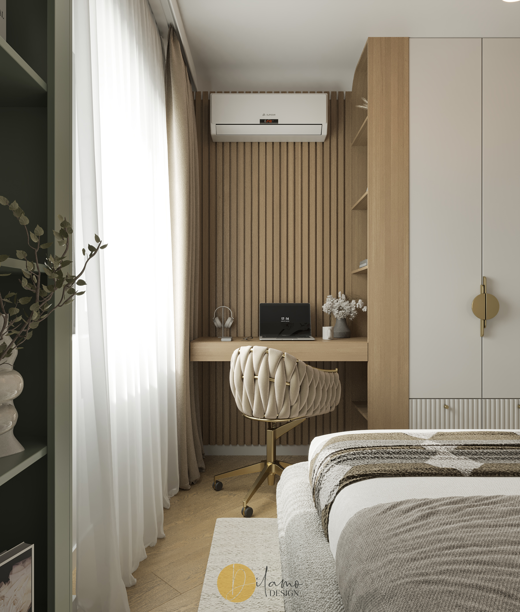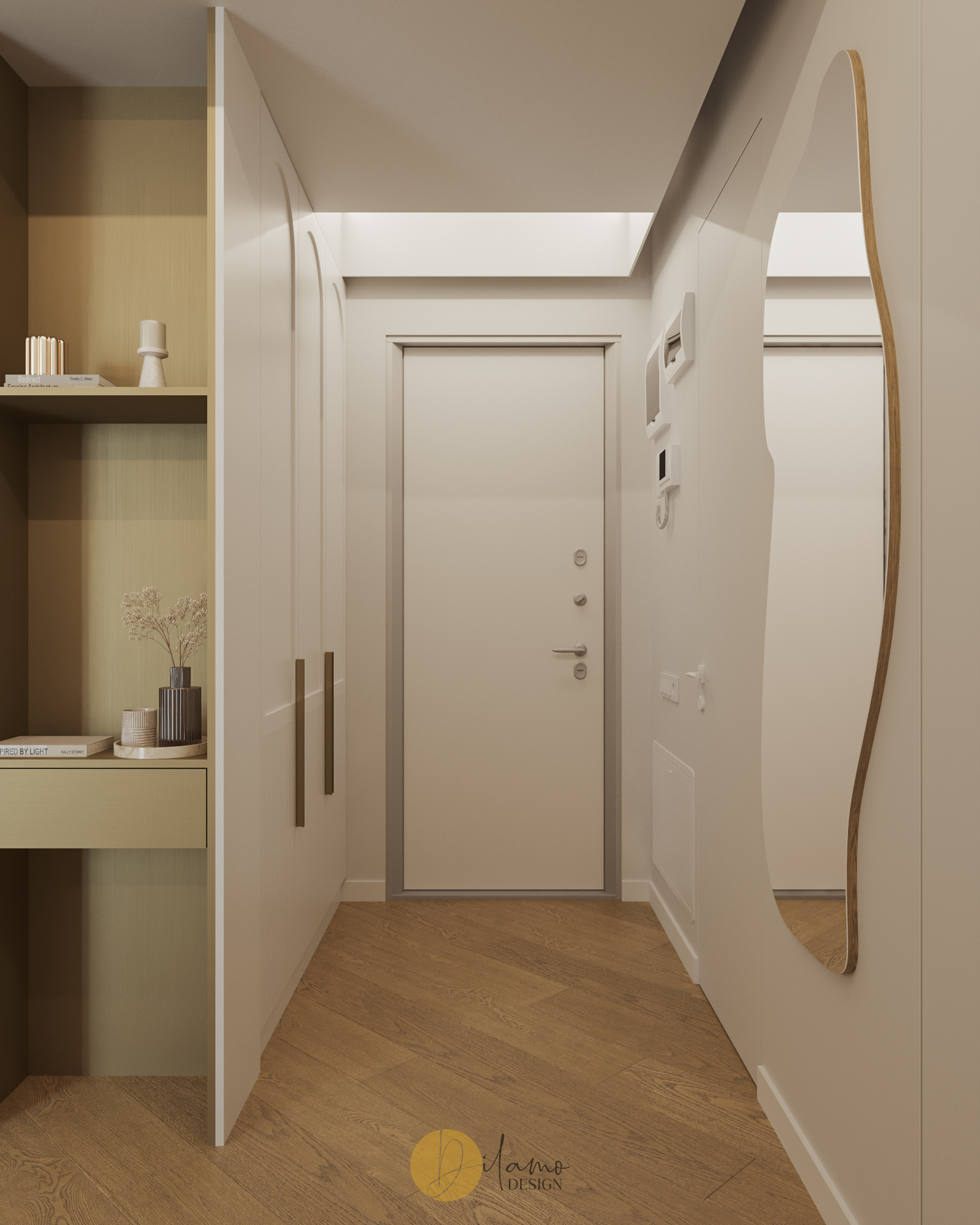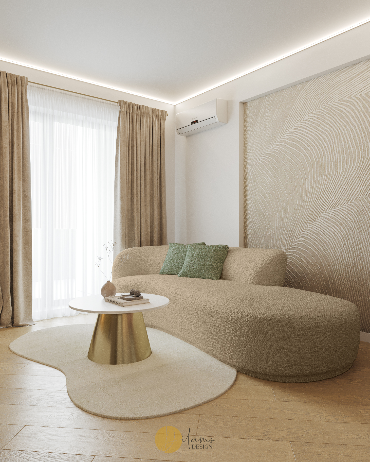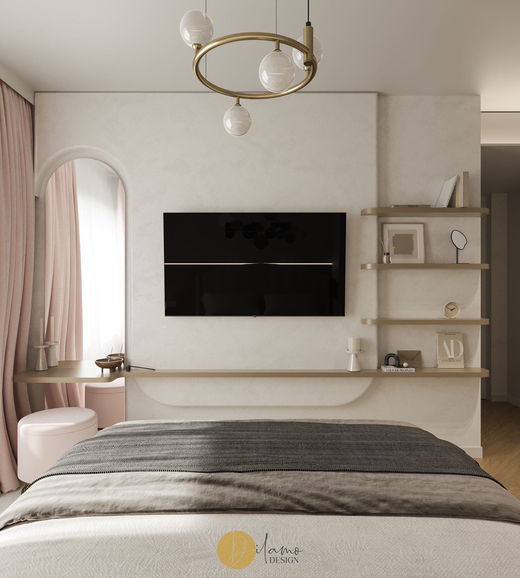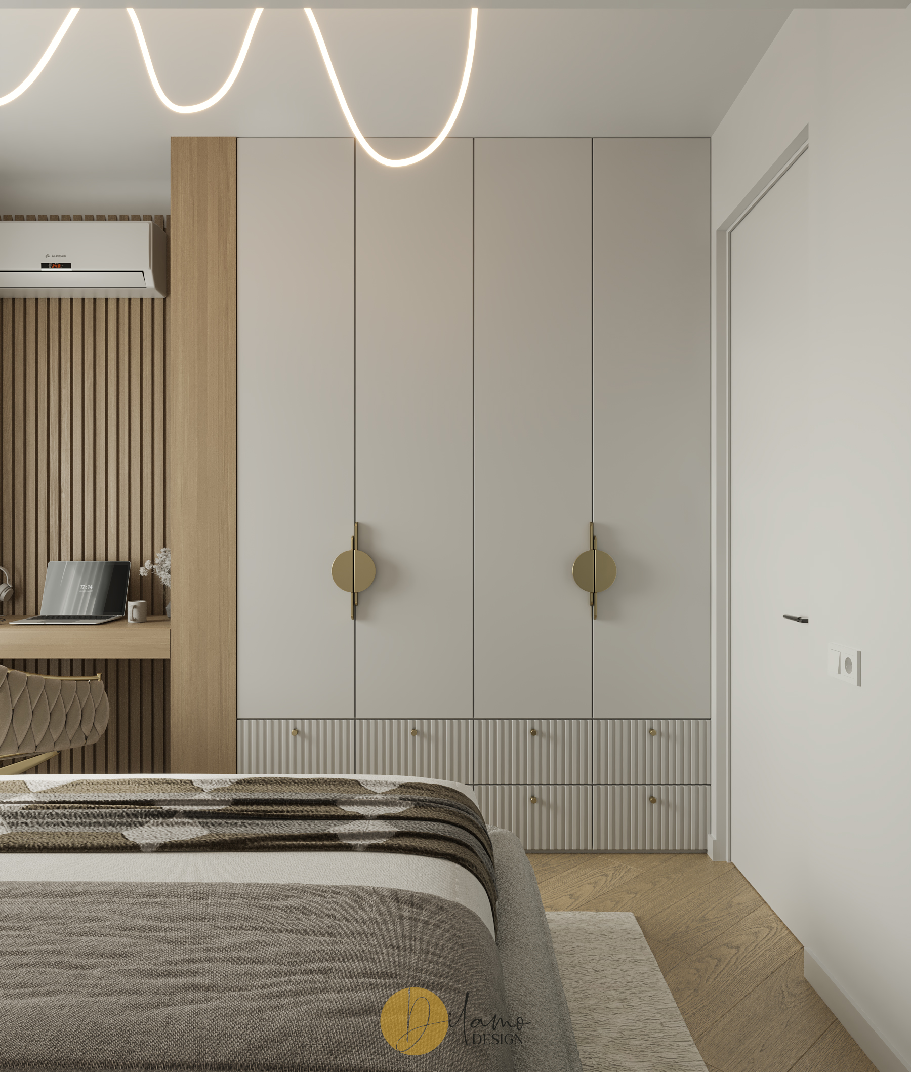 Te invităm într-un apartament chic, cochet, cu 2 camere, proiectat pentru un stil de viață activ și modern. Cromatica este veselă și primitoare, iar detaliile de auriu aduc un plus de rafinament amenajării Dilamo Design.