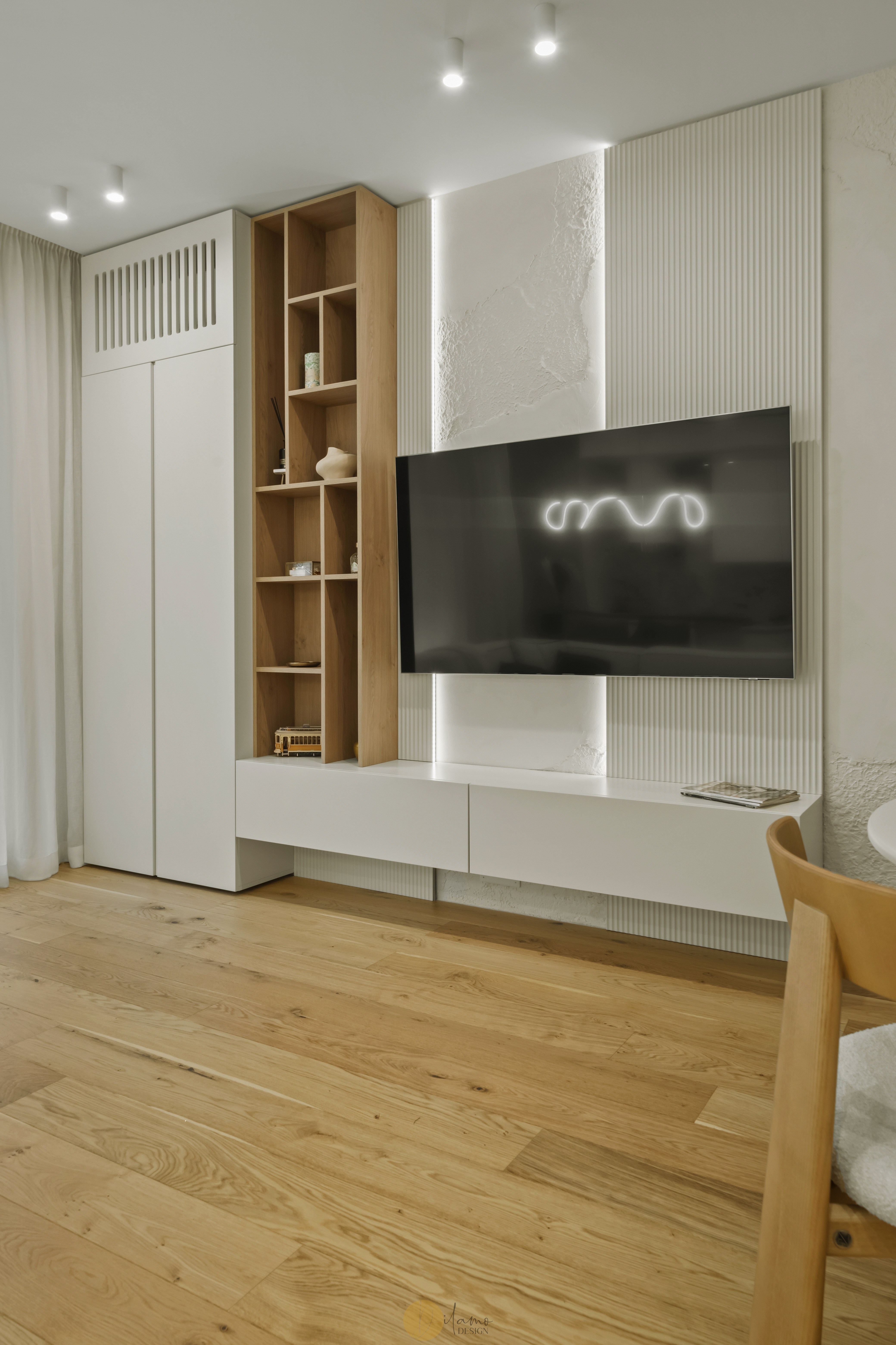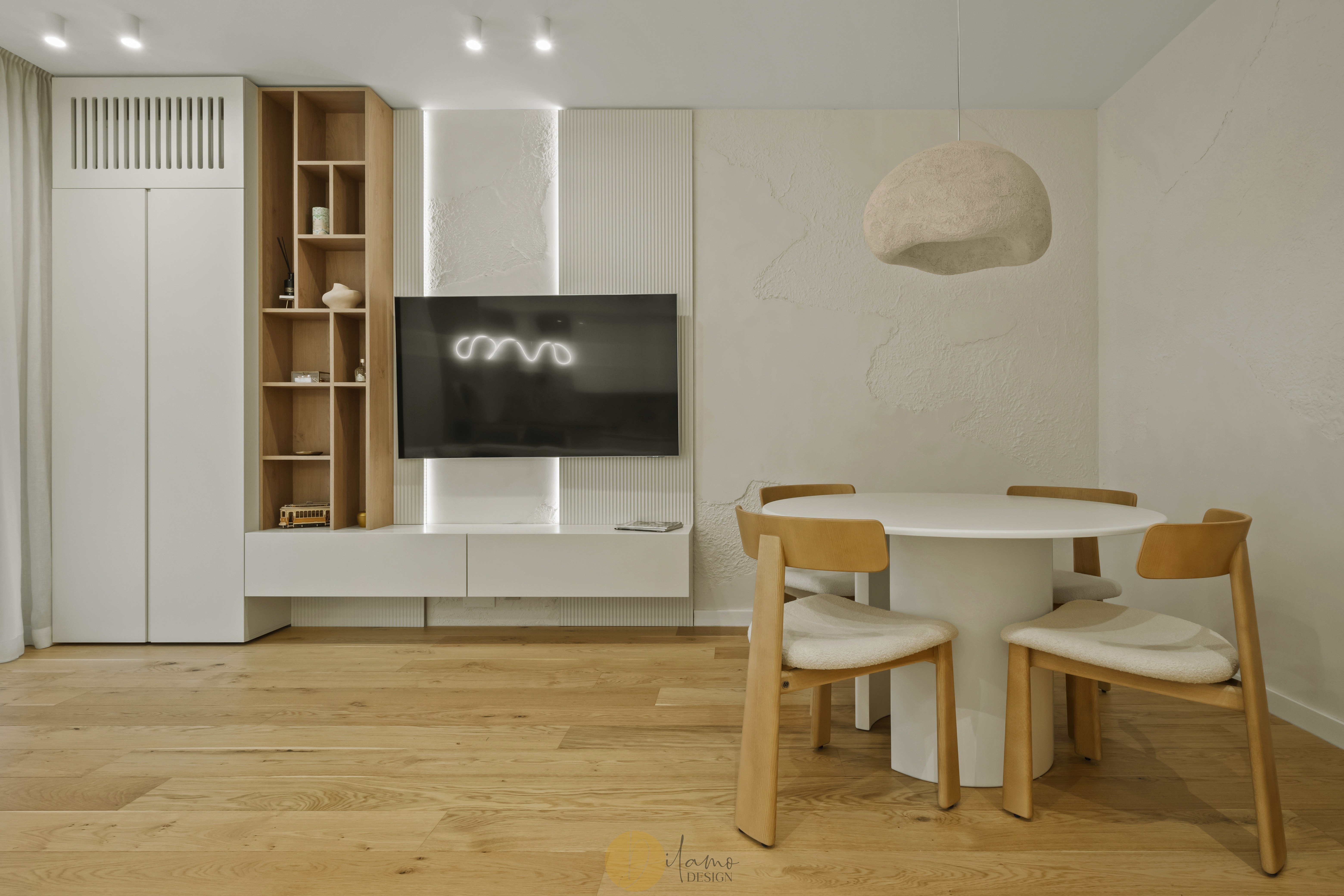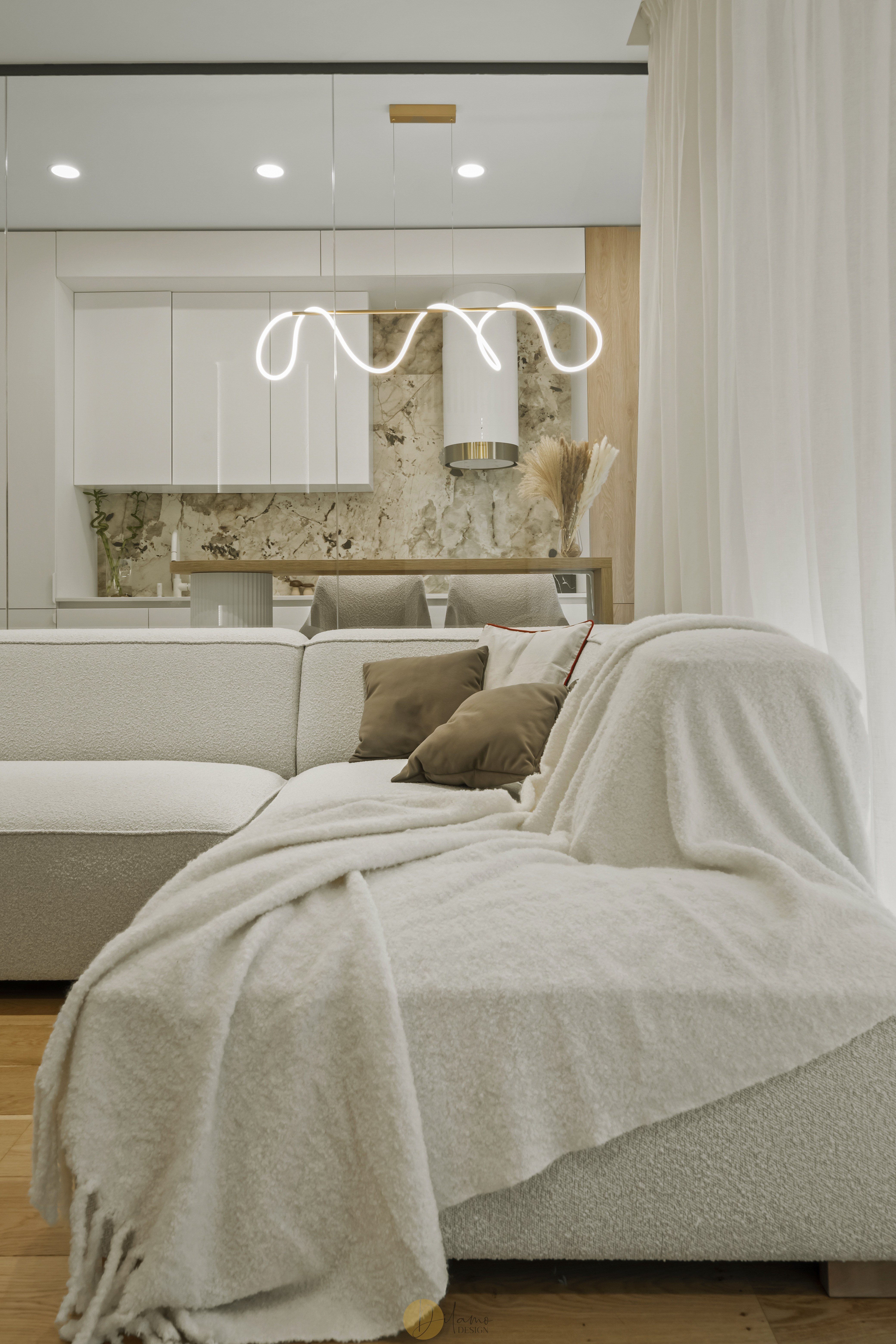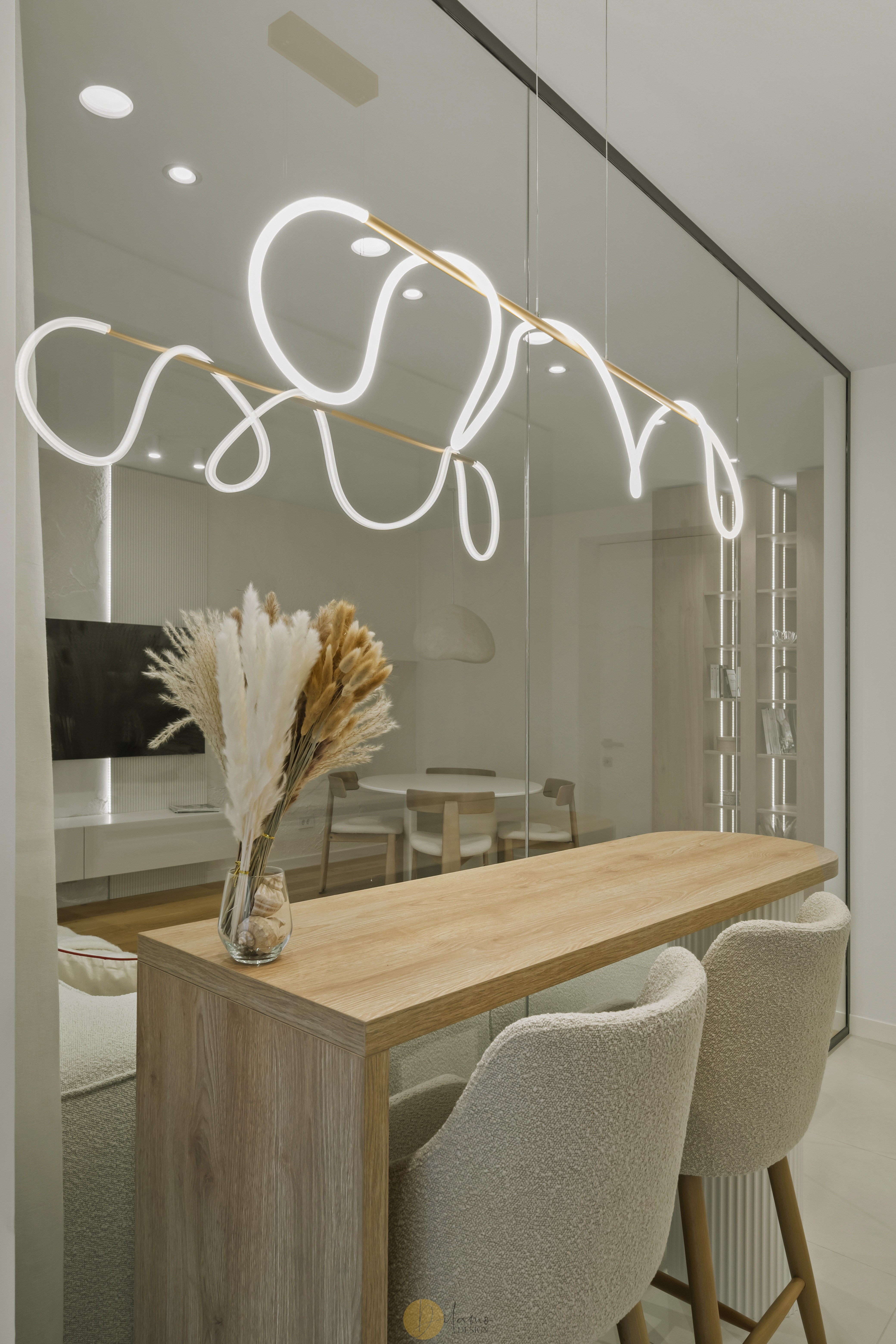 Am integrat un corp de iluminat vedetă, cu o formă modulară pentru un accent modern și am păstrat liniile clasice în detaliile de mobilier și piesele alese. Tonurile neutre oferă un aspect luminos și cald, care urmărește perfect atmosfera și energia pe care norocoșii rezidenți și-au dorit-o în noul apartament.
