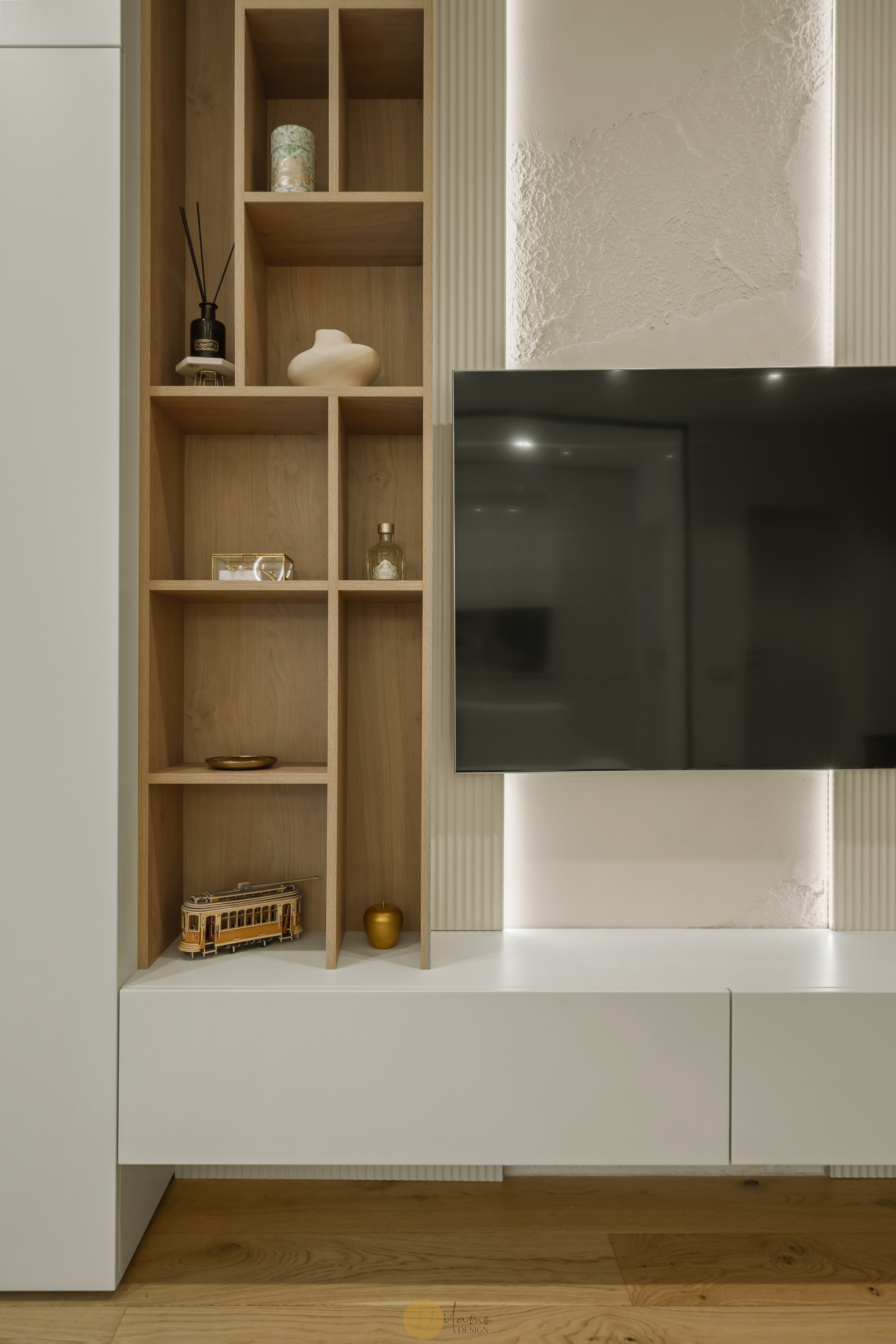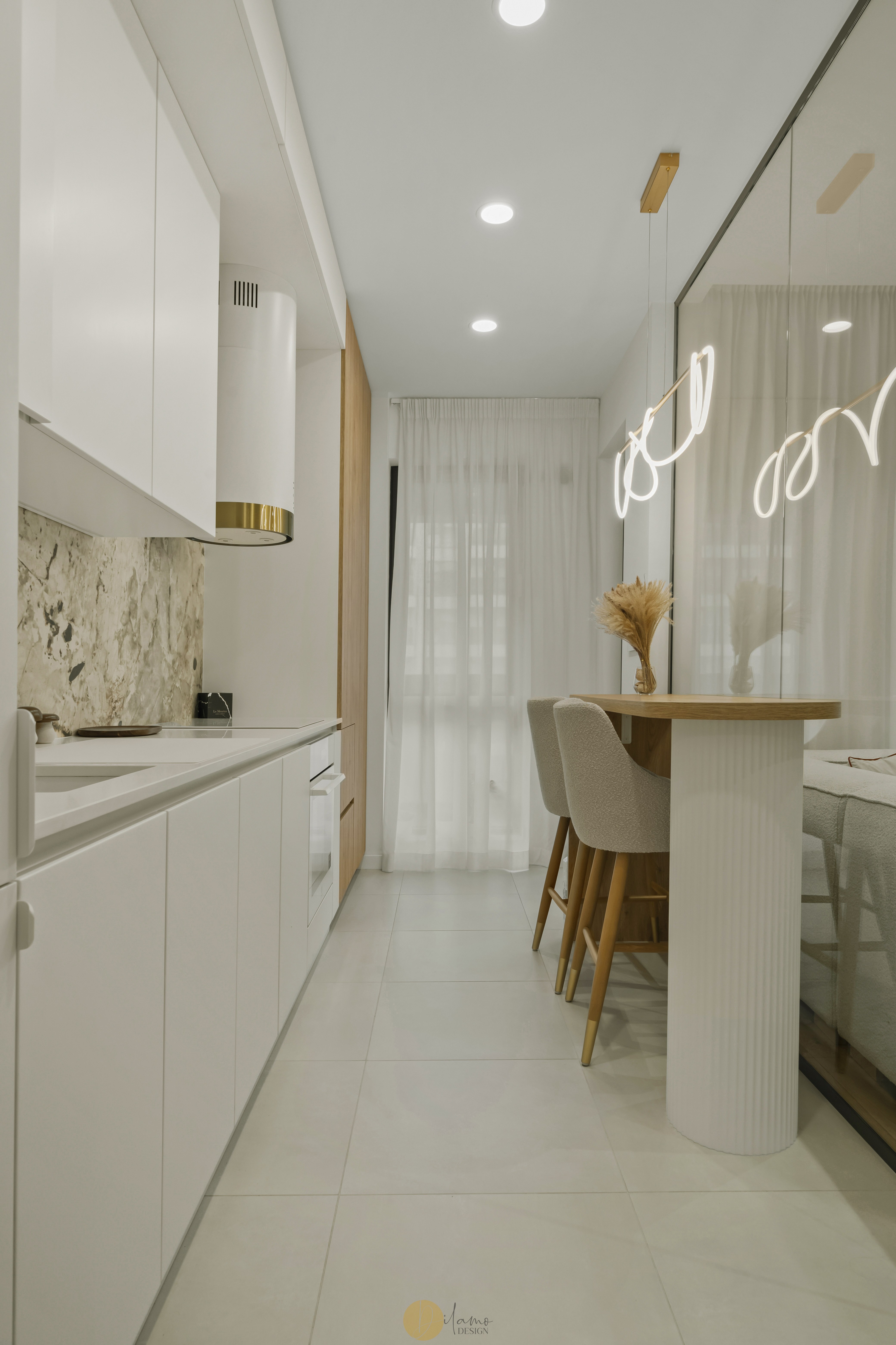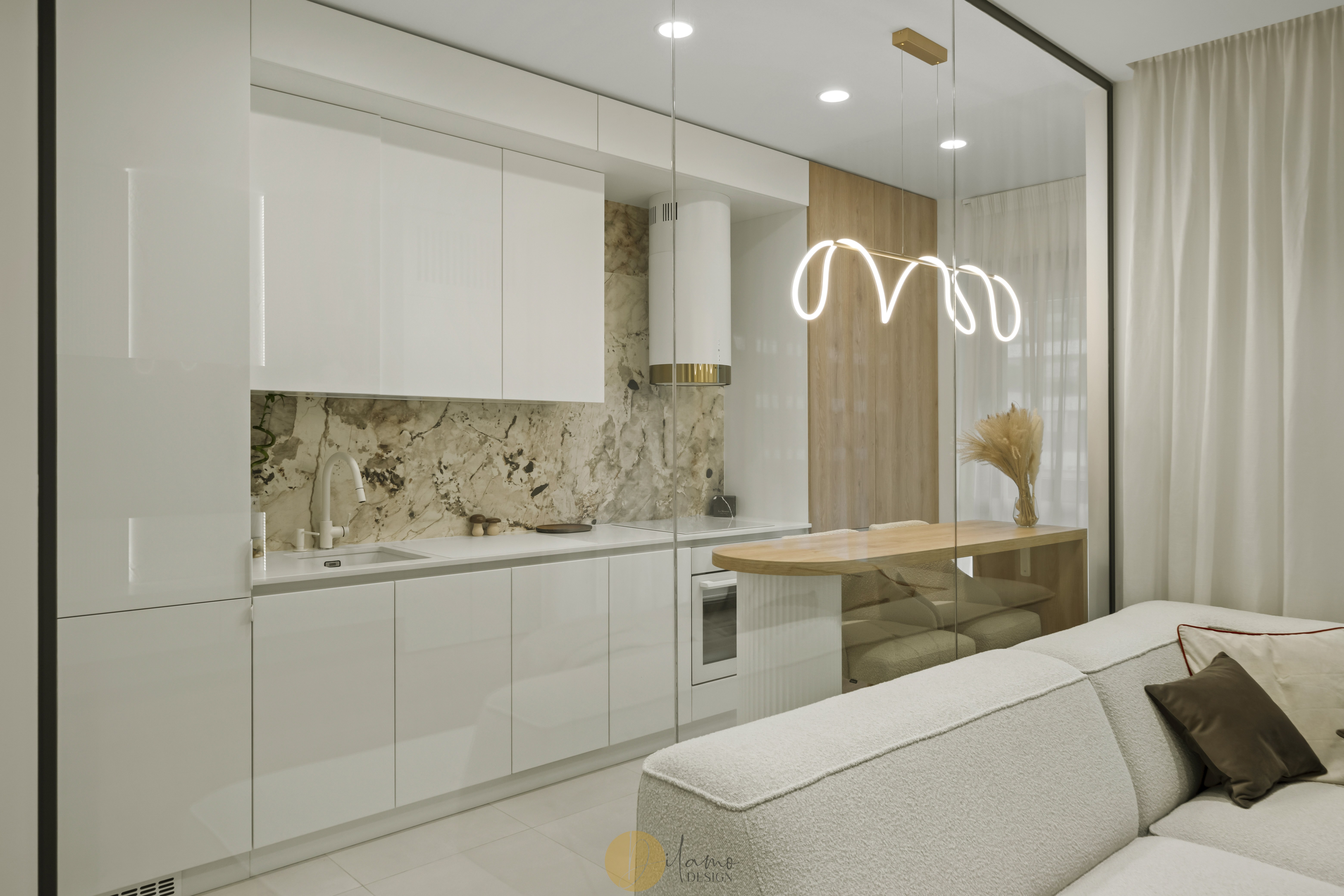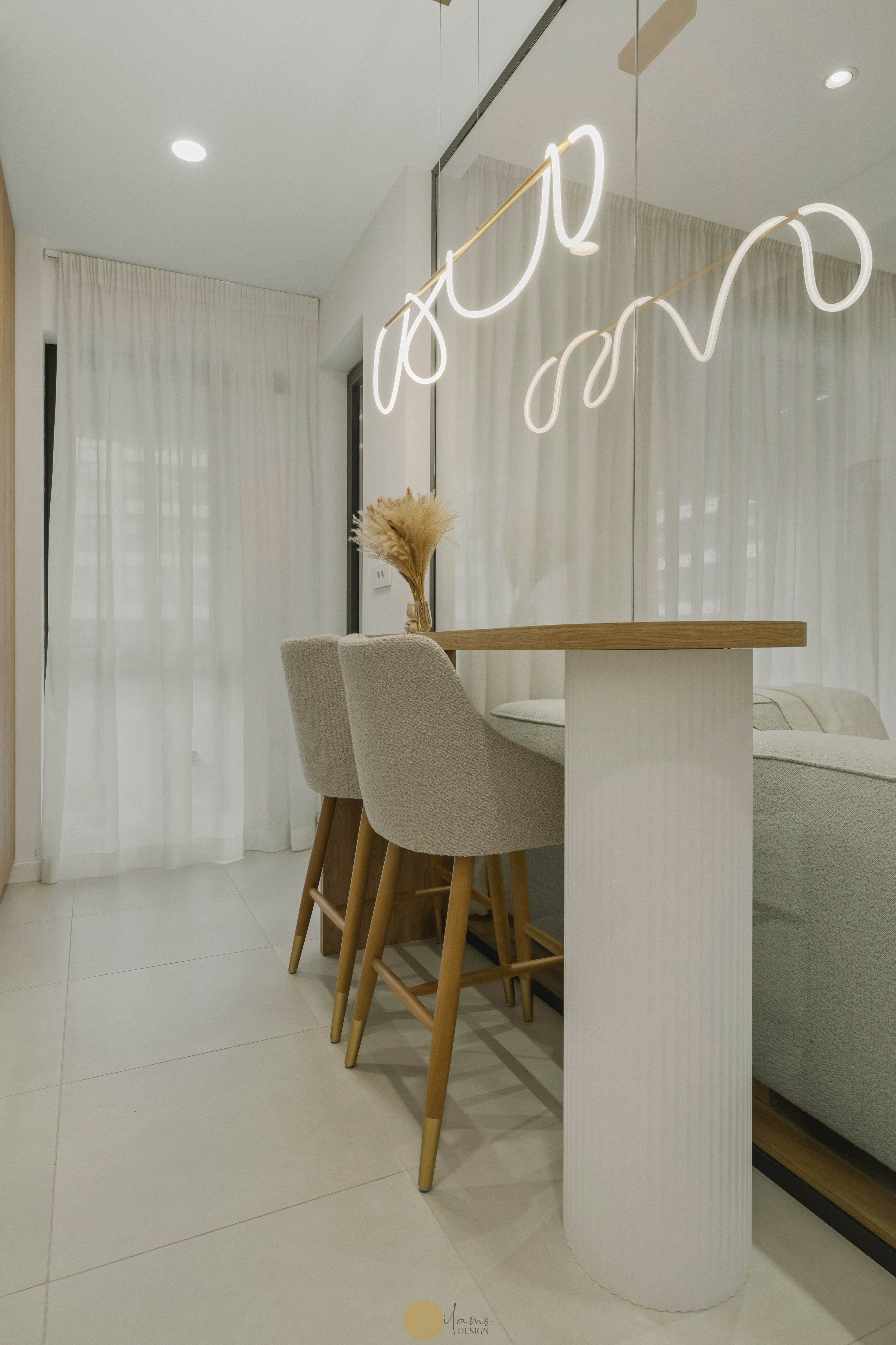 Am integrat un corp de iluminat vedetă, cu o formă modulară pentru un accent modern și am păstrat liniile clasice în detaliile de mobilier și piesele alese. Tonurile neutre oferă un aspect luminos și cald, care urmărește perfect atmosfera și energia pe care norocoșii rezidenți și-au dorit-o în noul apartament.